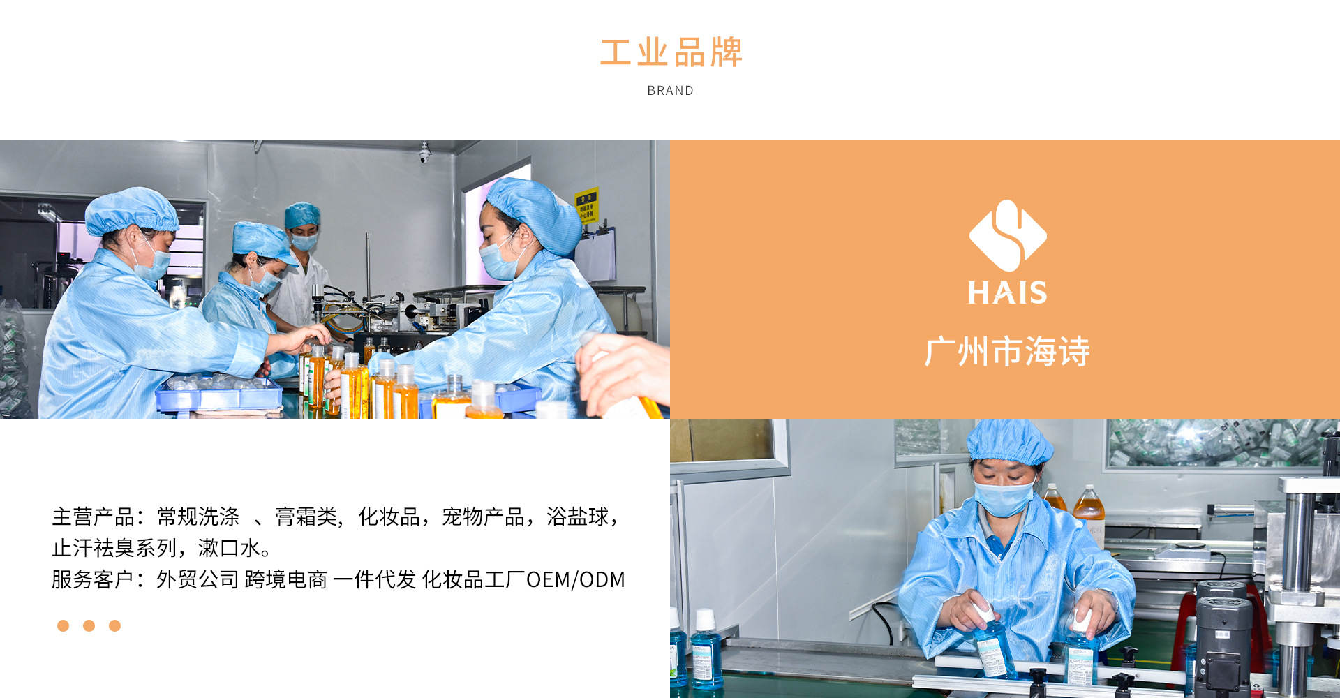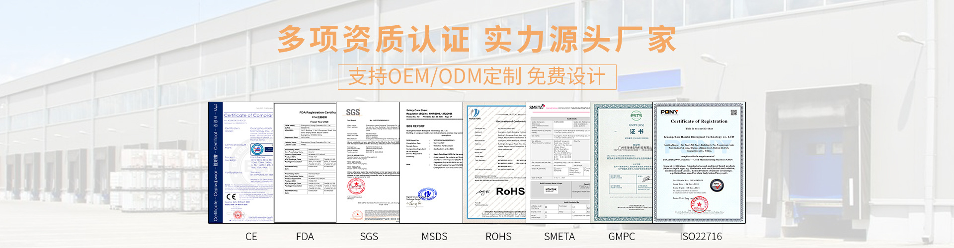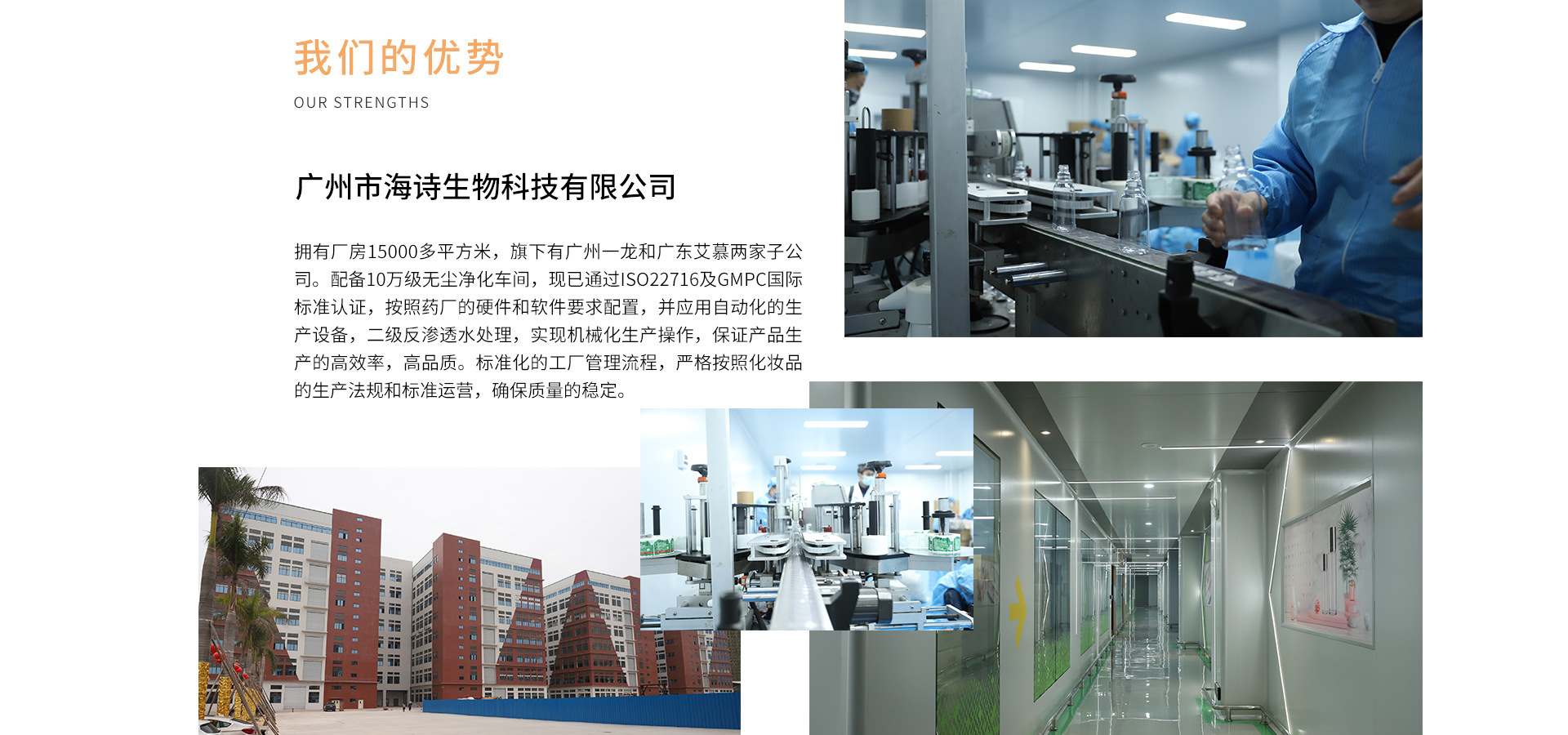 廣州市海詩生物科技有限公司擁有廠房15000多平方米,旗下有廣州一龍和廣東艾慕兩家子公司。配備10萬級無塵凈化車間,現(xiàn)已通過ISO22716及GMPC國際標準認證,按照藥廠的硬件和軟件要求配置,并應(yīng)用自動化的生產(chǎn)設(shè)備,二級反滲透水處理,實現(xiàn)機械化生產(chǎn)操作,保證產(chǎn)品生產(chǎn)的高效率,高品質(zhì)。標準化的工廠管理流程,嚴格按照化妝品的生產(chǎn)法規(guī)和標準運營,確保質(zhì)量的穩(wěn)定。 公司擁有自己的分析測試中心,同時實驗室配置了氣相色譜儀,液相色譜儀,紅外光譜儀,薄層色譜像儀、熔點儀等專業(yè)檢測設(shè)備,不僅可以做化妝品的常規(guī)理化測試,微生物測試,還可以獨立完成化妝品的成分功效等專業(yè)測試,確保產(chǎn)品處于受控狀態(tài)。