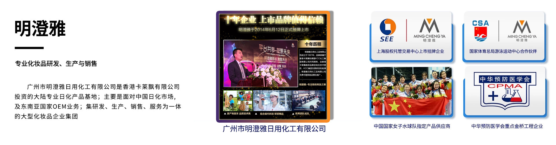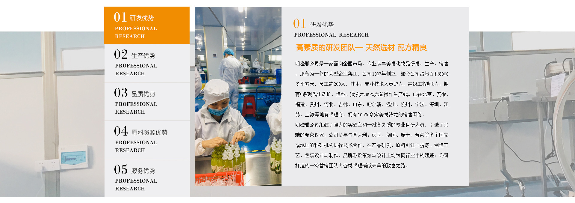 明澄雅公司是一家面向全國市場,專業(yè)從事美發(fā)化妝品研發(fā)、生產(chǎn)、銷售、服務(wù)為一體的大型企業(yè)集團(tuán),公司1997年創(chuàng)立,如今公司占地面積8000多平方米,員工約200人,