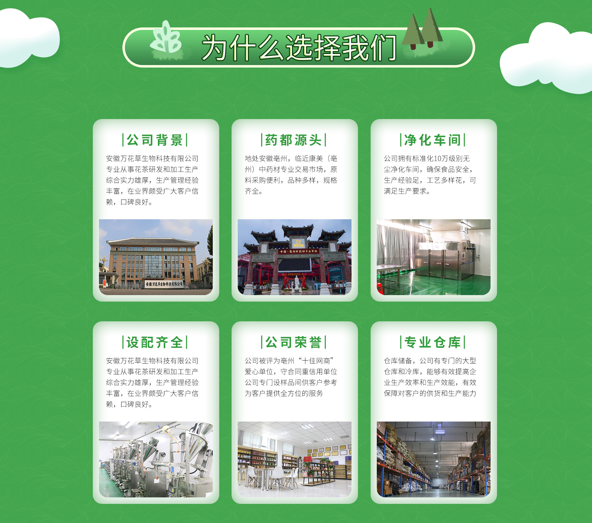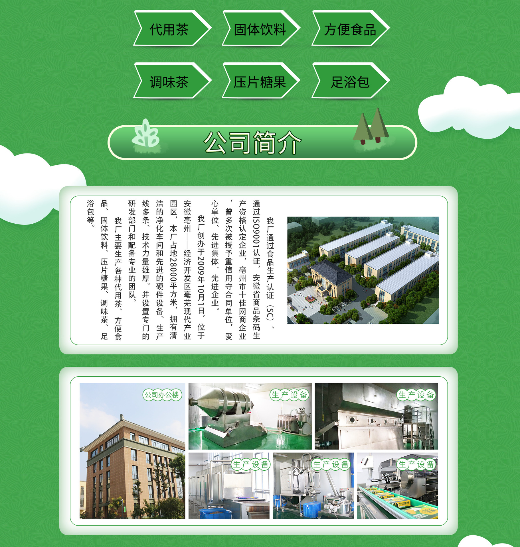 安徽萬花草生物科技有限公司坐落于安徽亳州蕪湖產業(yè)園,成立于2014年,注冊資金2000萬元整,公司坐落于漆園路南段,占地21600平方米,總建筑面積26000平方米,公司員工近600人,其中生產團隊470人,研發(fā)團隊25人,銷售團隊20人,后勤物資采購25人, 新廠區(qū)已經(jīng)投入使用,預計年產值3億元 創(chuàng)稅收900萬。本公司是一家致力于集科研開發(fā)、產品生產、物流配送、市場銷售為一體的,服務于全國客戶的公司。 公司主要經(jīng)營范圍為:固體飲料、速溶顆粒、代用茶、含茶制品、固體飲料、方便食品、日化產品生產銷售等其他相關食品的生產銷售。