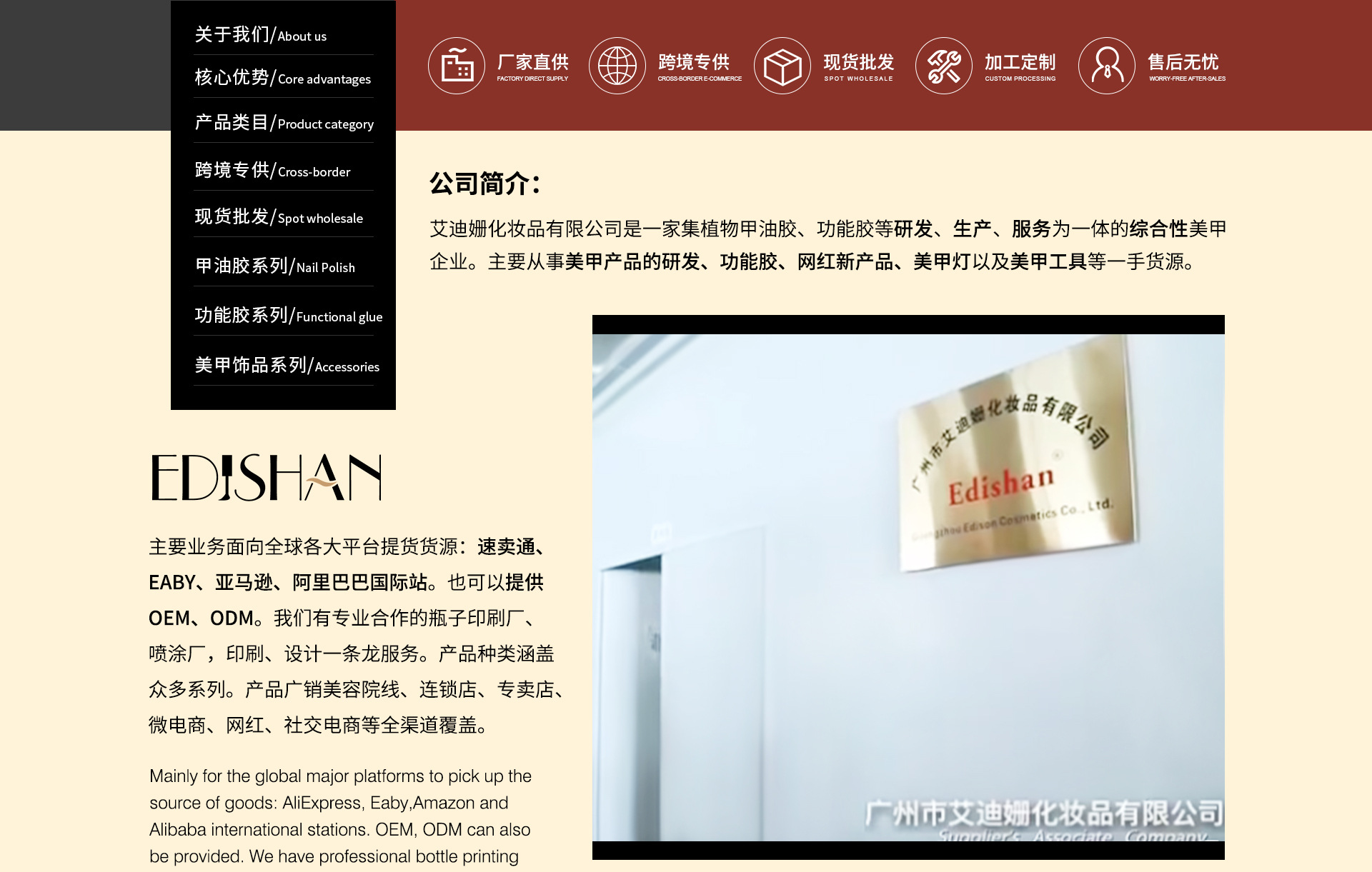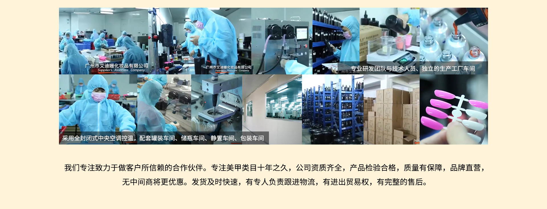廣州市艾迪姍化妝品有限公司是甲油膠、美甲延長(zhǎng)膠、美甲功能膠、美甲燈、美甲工具批發(fā)等產(chǎn)品專業(yè)生產(chǎn)加工的公司,擁有完整、科學(xué)的質(zhì)量管理體系。廣州市艾迪姍化妝品有限公司的誠(chéng)信、實(shí)力和產(chǎn)品質(zhì)量獲得業(yè)界的認(rèn)可。歡迎各界朋友蒞臨參觀、指導(dǎo)和業(yè)務(wù)洽談。