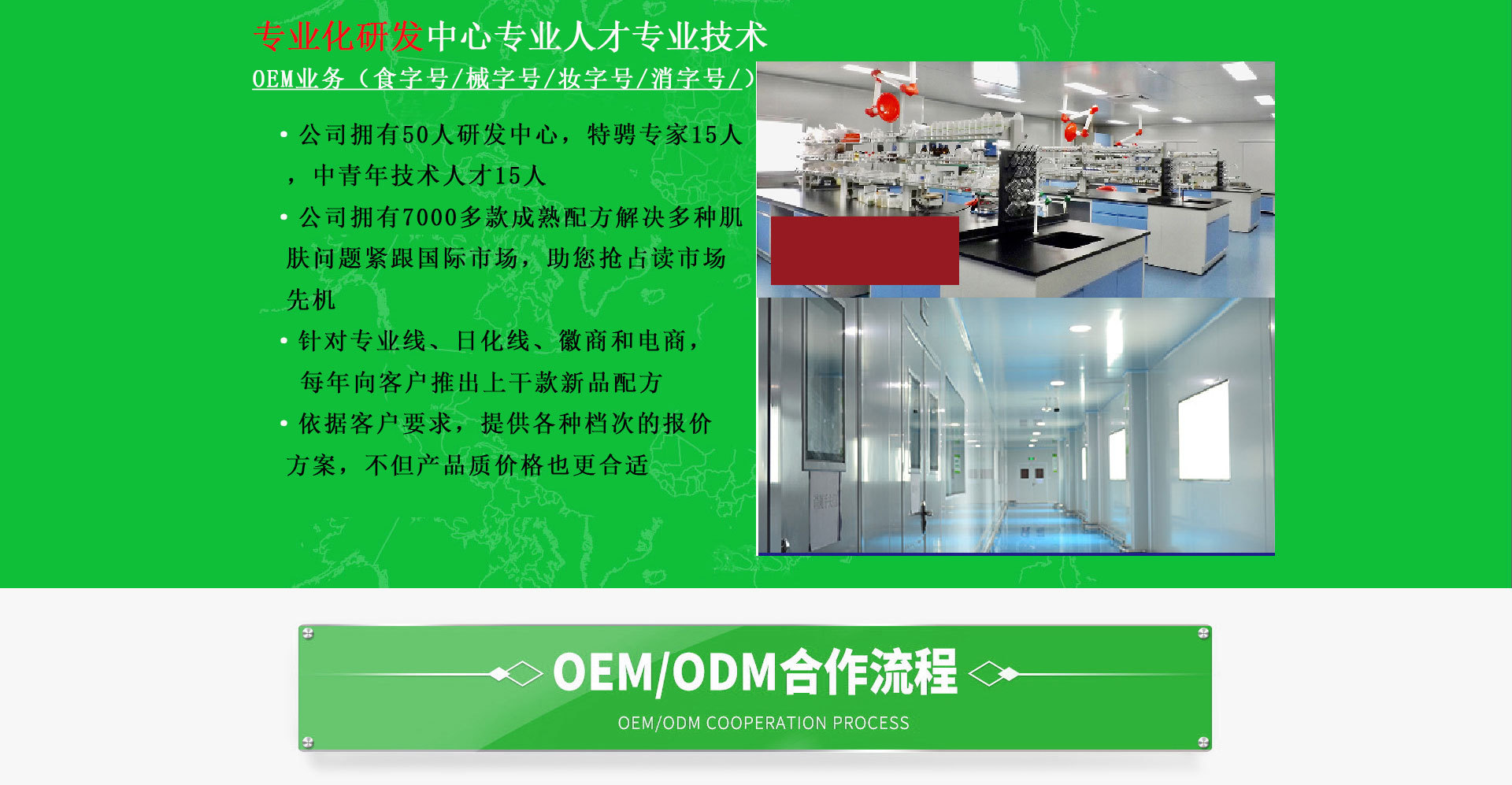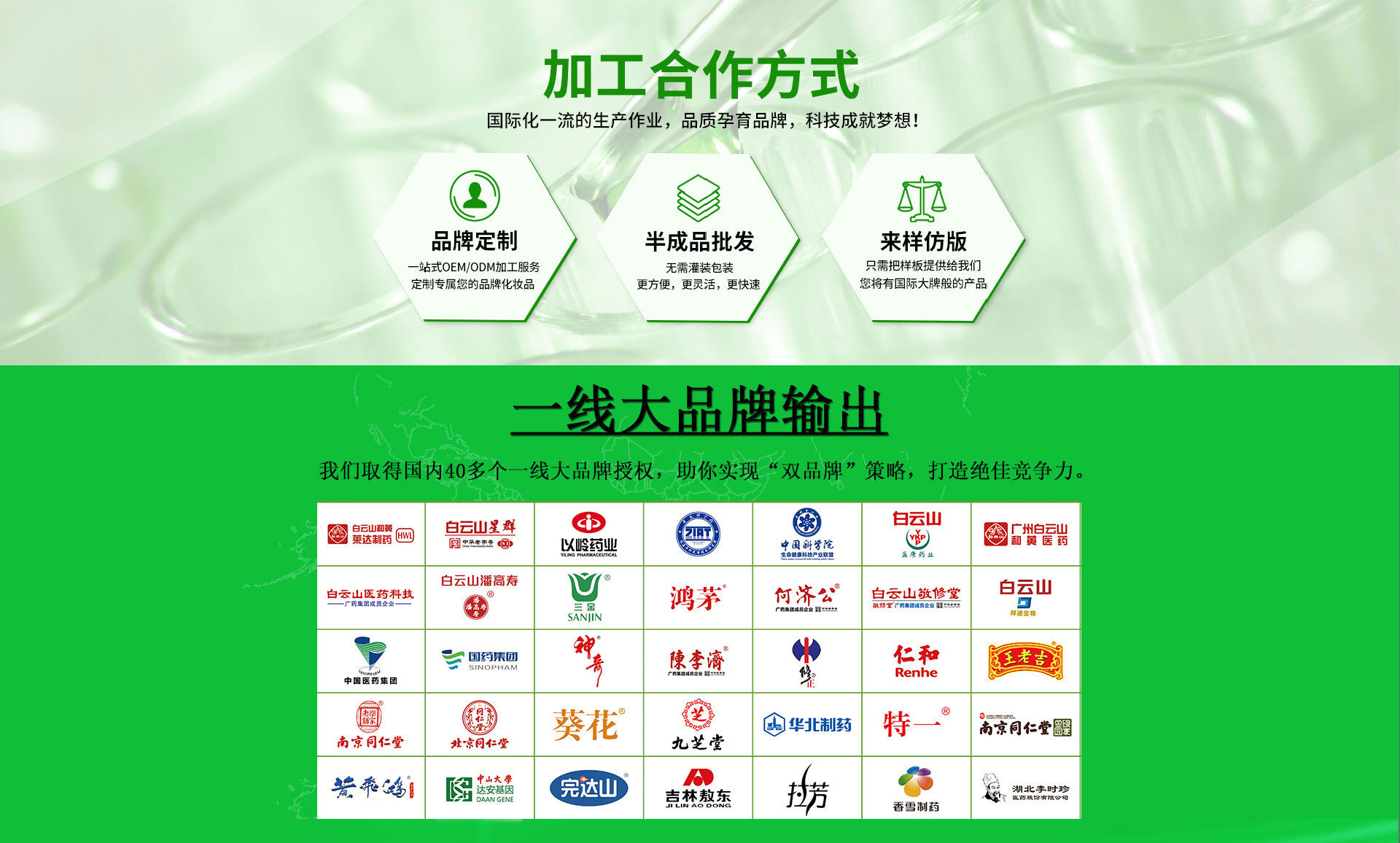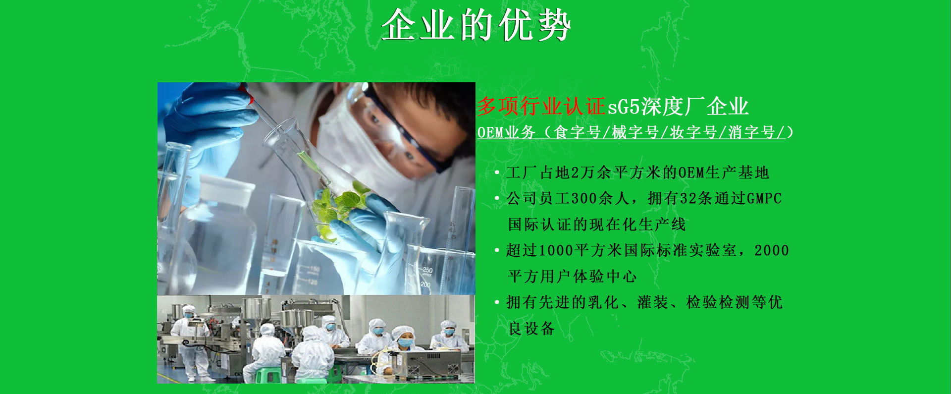 廣州中科醫(yī)藥科技有限公司是一家 多項(xiàng)行業(yè)認(rèn)證sG5深度廠企業(yè)OEM業(yè)務(wù)(食字號/械字號/妝字號/消字號) ·工廠占地2萬余平方米的OEM生產(chǎn)基地 ·公司員工300余人,擁有32條通過GMPC國際認(rèn)證的現(xiàn)在化生產(chǎn)線 ·超過1000平方米國際標(biāo)準(zhǔn)實(shí)驗(yàn)室,2000平方用戶體驗(yàn)中心 ·擁有先進(jìn)的乳化、灌裝、檢驗(yàn)檢測等優(yōu)良設(shè)備; 專業(yè)化研發(fā)中心專業(yè)人才專業(yè)技術(shù)OEM業(yè)務(wù) ·公司擁有50人研發(fā)中心,特騁專家15人,中青年技術(shù)人才15人 ·公司擁有7000多款成熟配方解決多種肌膚問題緊跟國際市場,助您搶占讀市場先機(jī) ·針對專業(yè)線、日化線、徽商和電商,每年向客戶推出上干款新品配方 ·依據(jù)客戶要求,提供各種檔次的報(bào)價(jià)方案,產(chǎn)品質(zhì)優(yōu),價(jià)格也更合適。