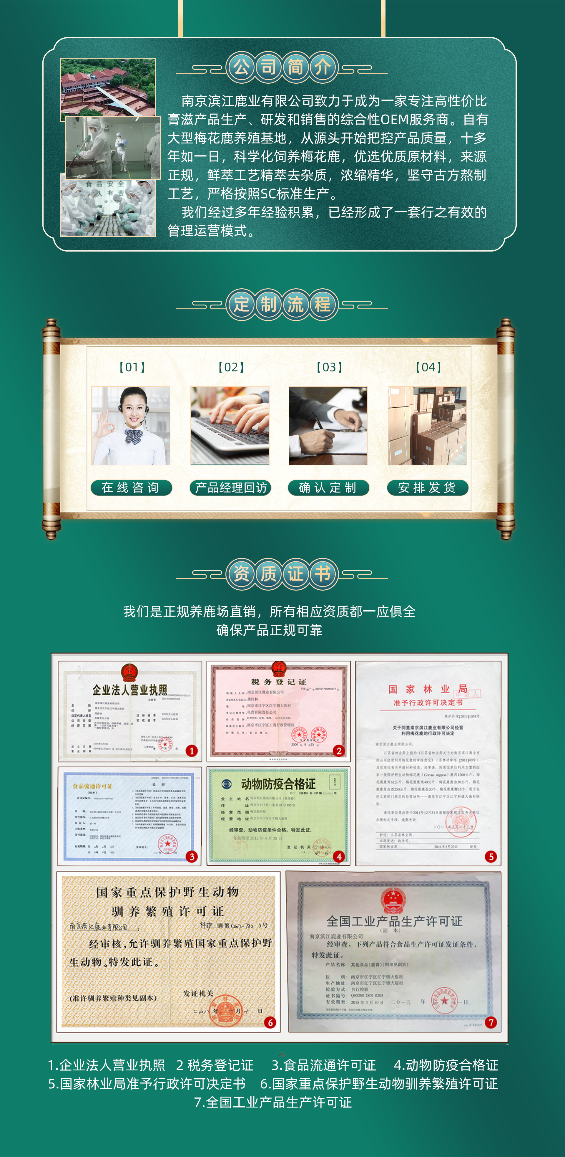 一瓶好膏,鹿為本 至真至臻,專注專業(yè),宜露背后是濱江鹿業(yè)人堅(jiān)守的初心。 養(yǎng)殖基地始建于1999,宜露濱江鹿業(yè),一直以敬畏之心專研于鹿滋補(bǔ)領(lǐng)域。我們堅(jiān)持科學(xué)養(yǎng)殖,并建鹿業(yè)合作社,采用專業(yè)的養(yǎng)殖團(tuán)隊(duì)為鹿群篩選草飼食糧配方,只為保證鹿原料醇真。中醫(yī)藥大學(xué)專家研發(fā)團(tuán)隊(duì)配方,真實(shí)藥食同源中藥熬制,72小時(shí)凝煉,鮮萃提純,每一滴都豐潤掛旗不透光乃膏中臻品。 因?yàn)橥瑫r(shí)具備養(yǎng)殖和生產(chǎn)雙重專業(yè)度,宜露品質(zhì)為鹿滋補(bǔ)的行業(yè)樹立標(biāo)桿,我們更早通過國家食藥局sc認(rèn)證鹿制品,專注更專業(yè)。 堅(jiān)守傳承御用古方,采用創(chuàng)新提純技術(shù),讓皇室滋補(bǔ)走進(jìn)千萬家。 從養(yǎng)殖到生產(chǎn),宜露用心把控產(chǎn)品質(zhì)量,只為讓更多人享用到正宗道地包含誠意的鹿珍品。