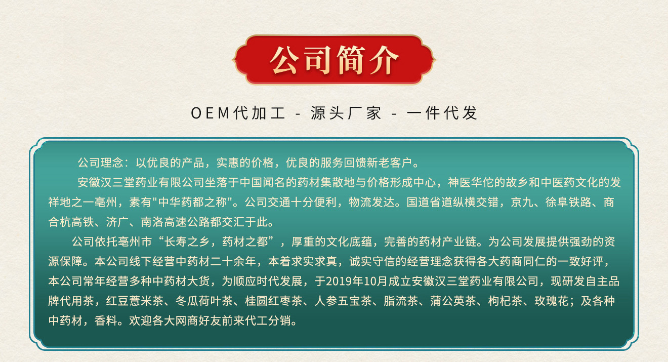 安徽漢三堂藥業(yè)有限公司坐落于中國(guó)聞名的藥材集散地與價(jià)格形成中心,神醫(yī)華佗的故鄉(xiāng)和中醫(yī)藥文化的發(fā)祥地之一亳州,素有"中華藥都之稱(chēng)"。公司交通十分便利,物流發(fā)達(dá)。國(guó)道省道縱橫交錯(cuò),京九、徐阜鐵路、商合杭高鐵、濟(jì)廣、南洛高速公路都交匯于此。 公司依托亳州市”長(zhǎng)壽之鄉(xiāng),藥材之都”,厚重的文化底蘊(yùn),完善的藥材產(chǎn)業(yè)鏈。為公司發(fā)展提供強(qiáng)勁的資源保障。本公司線下經(jīng)營(yíng)中藥材二十余年,本著求實(shí)求真,誠(chéng)實(shí)守信的經(jīng)營(yíng)理念獲得各大藥商同仁的一致好評(píng),本公司常年經(jīng)營(yíng)多種中藥材大貨,為順應(yīng)時(shí)代發(fā)展,于2019年10月成立安徽漢三堂藥業(yè)有限公司,現(xiàn)研發(fā)自主品牌代用茶,紅豆薏米茶、冬瓜荷葉茶、桂圓紅棗茶、人參五寶茶、脂流茶、蒲公英茶、枸杞茶、玫瑰花;及各種中藥材,香料。歡迎各大網(wǎng)商好友前來(lái)代工分銷(xiāo)