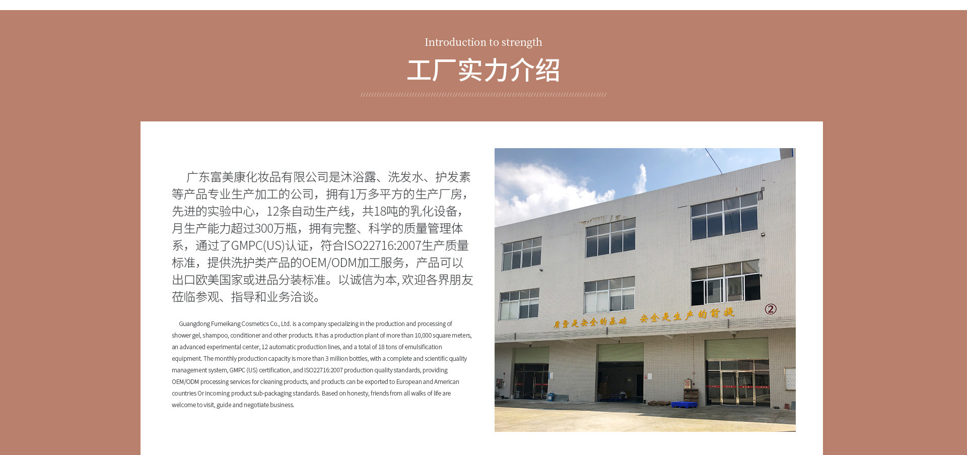 廣東富美康化妝品有限公司是沐浴露、洗發(fā)水、護發(fā)素等產(chǎn)品專業(yè)生產(chǎn)加工的公司,擁有1萬多平方的生產(chǎn)廠房,先進的實驗中心,12條自動生產(chǎn)線,共18噸的乳化設備,月生產(chǎn)能力超過300萬瓶,擁有完整、科學的質(zhì)量管理體系,通過了GMPC(US)認證,符合ISO22716:2007生產(chǎn)質(zhì)量標準,提供洗護類產(chǎn)品的OEM/ODM加工服務,產(chǎn)品可以出口歐美國家或進品分裝標準。以誠信為本, 歡迎各界朋友蒞臨參觀、指導和業(yè)務洽談。