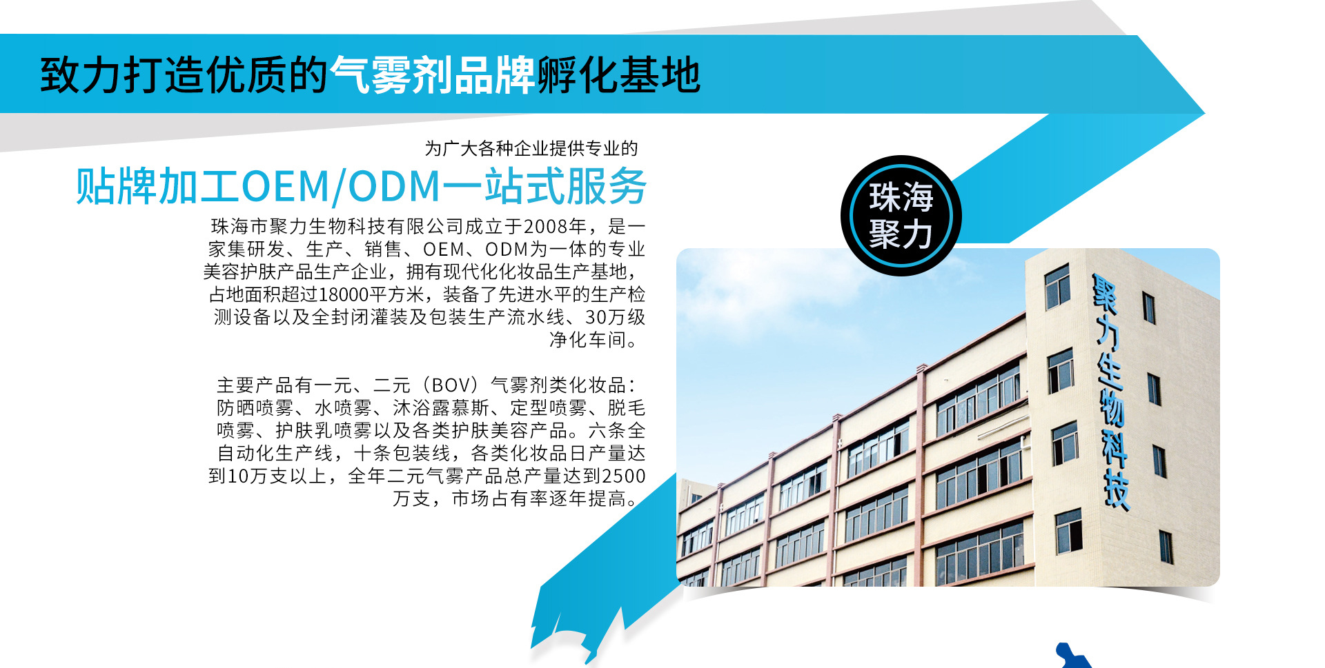 珠海市聚力生物科技有限公司是氣霧劑生產(chǎn)加工、OEM定制生產(chǎn)等產(chǎn)品專業(yè)生產(chǎn)加工的公司,擁有完整、科學(xué)的質(zhì)量管理體系。珠海市聚力生物科技有限公司的誠信、實力和產(chǎn)品質(zhì)量獲得業(yè)界的認(rèn)可。歡迎各界朋友蒞臨參觀、指導(dǎo)和業(yè)務(wù)洽談。