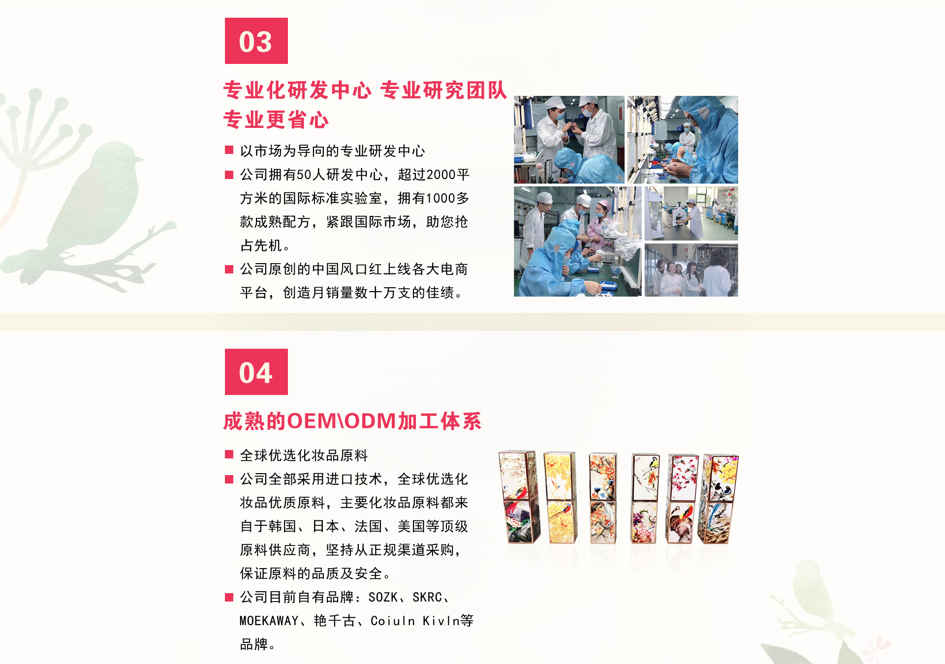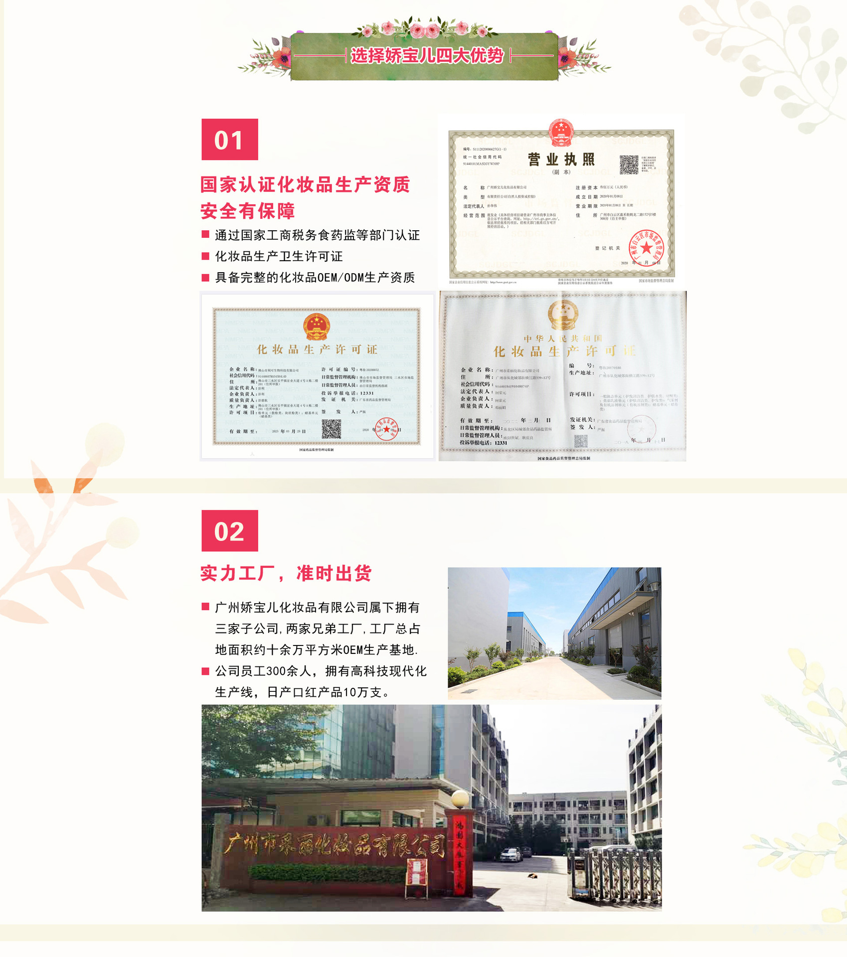 1、 通過國家工商稅務食藥監(jiān)等部門認證,化妝品生產衛(wèi)生許可證,具備完整的化妝品OEM生產資質。 2、 廣州嬌寶兒化妝品有限公司屬下擁有三家子公司,兩家兄弟工廠,工廠總占地面積約十余萬平方米的OEM生產基地。 公司員工300余人,擁有高科技現代化生產線,日產口紅產口10萬支。 超過2000平方米的國際標準實驗室。 3、 專業(yè)化的以市場為導向的專業(yè)研發(fā)中心 公司擁有50人研發(fā)中心,擁有1000多款成熟配方,緊跟國際市場,助您搶占先機 公司原創(chuàng)的中國風口紅上線各大電商平臺,創(chuàng)造月銷量數十萬支的佳績。 4、全球優(yōu)選化妝品原料 公司全部采用進口技術,全球優(yōu)選化妝品優(yōu)質原料,主要化妝品原料都來自于韓國、日本、法國、美國等頂級原料供應商,堅持從正規(guī)渠道采購,保證原料的品質及安全。 公司目前自有品牌:SOZK、SKRC、MOEKAWAY、艷千古、Coiuln Kivln等品牌