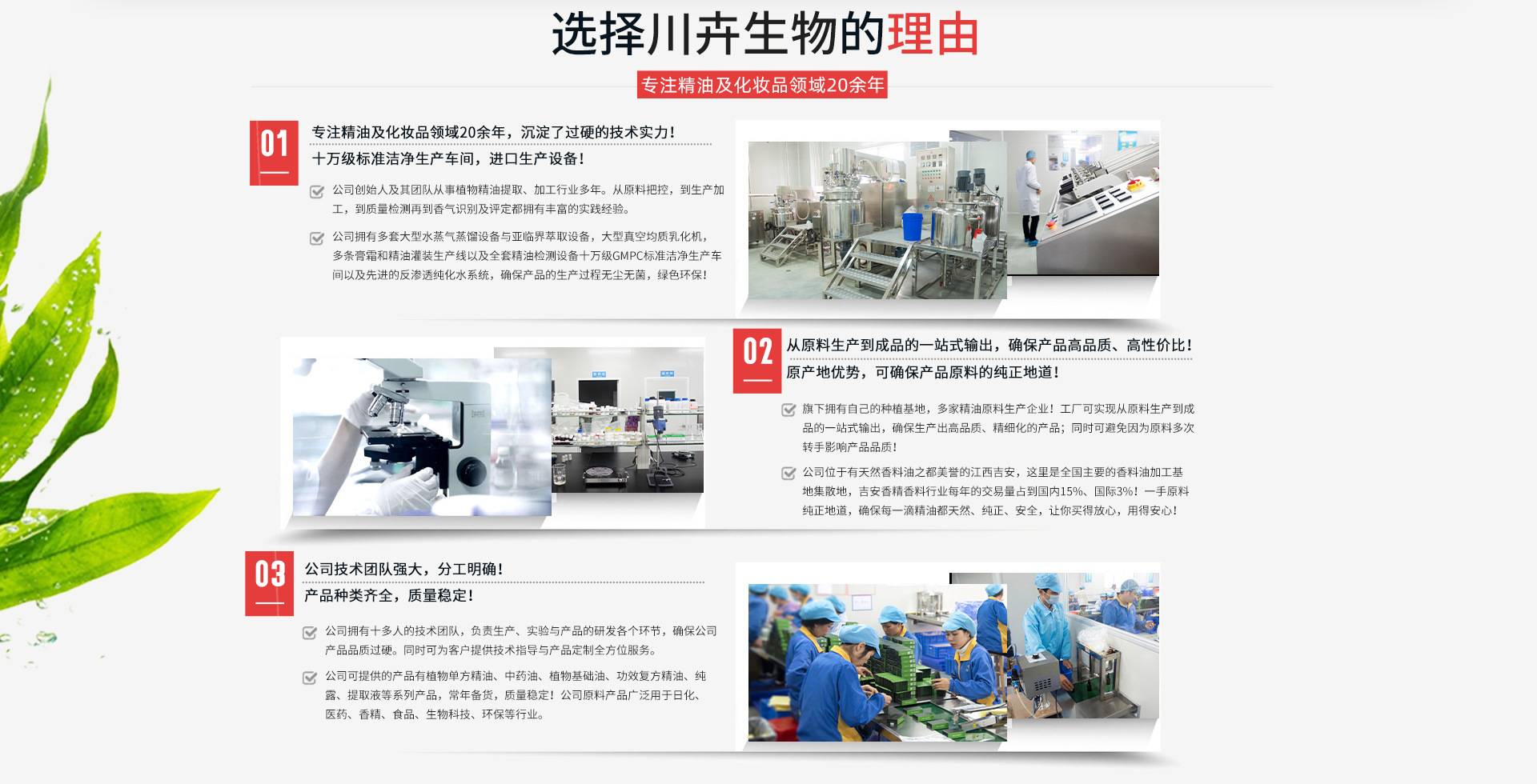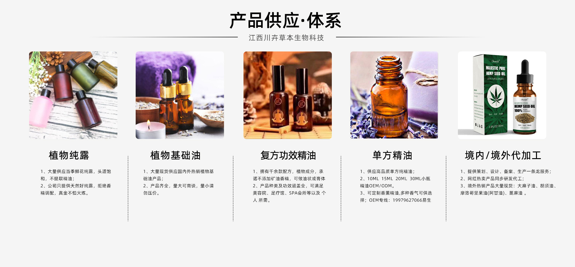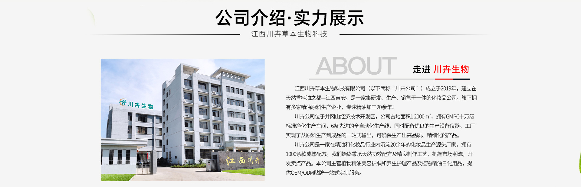 江西川卉草本生物科技有限公司(以下簡稱“川卉公司”)成立于2019年,建立在天然香料油之都—江西吉安。是一家集研發(fā)、生產(chǎn)、銷售于一體的化妝品公司。旗下?lián)碛卸嗉揖驮仙a(chǎn)企業(yè),專注精油加工20余年! 川卉公司位于國家級井岡山經(jīng)濟(jì)技術(shù)開發(fā)區(qū),公司占地面積1 2000m2,擁有GMPC十萬級標(biāo)準(zhǔn)凈化生產(chǎn)車間,6條先進(jìn)的全自動(dòng)化生產(chǎn)線,同時(shí)配備先進(jìn)的生產(chǎn)設(shè)備儀器。工廠實(shí)現(xiàn)了從原料生產(chǎn)到成品的一站式輸出,可確保生產(chǎn)出高品質(zhì)、精細(xì)化的產(chǎn)品。 川卉公司是一家在精油和化妝品行業(yè)內(nèi)沉淀20余年的化妝品生產(chǎn)源頭廠家,擁有1000余款成熟配方。我們始終秉承天然功效配方及精良制作工藝,把握市場潮流,開發(fā)賣點(diǎn)產(chǎn)品。本公司主營植物精油美容護(hù)膚和養(yǎng)生護(hù)理產(chǎn)品及植物精油日化用品,提供OEM/ODM貼牌加工一站式定制服務(wù)。