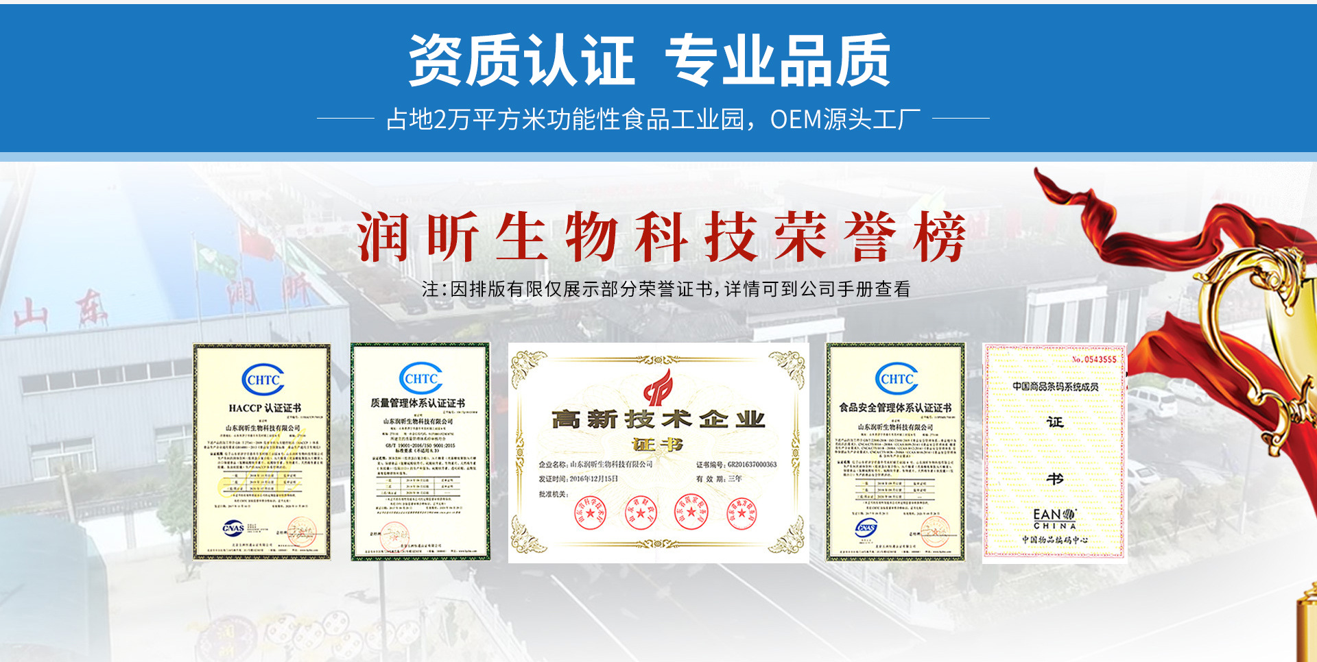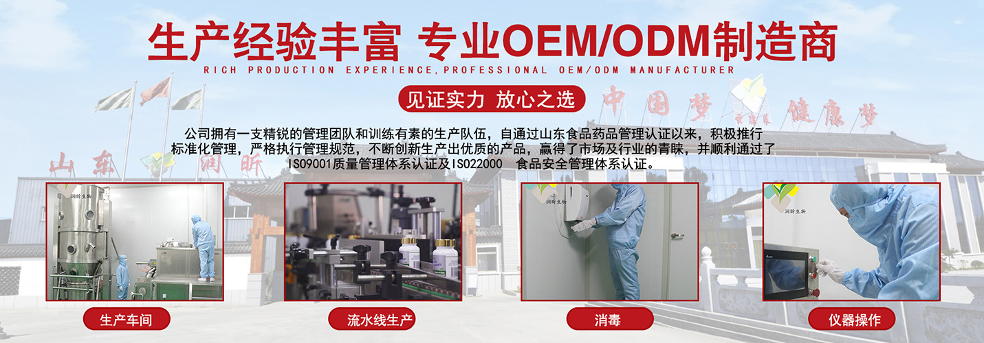 山東潤昕生物科技有限公司坐落于孔子故里——曲阜,現(xiàn)有QS認證和GMP標準廠房車間,研發(fā)設備、生產(chǎn)、檢驗儀器齊全,嚴格按照ISO和GMP進行質量管理,確保產(chǎn)品質量符合國家標準。