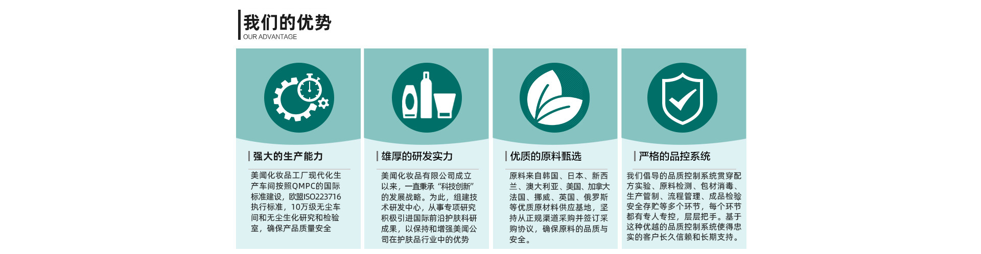 廣州美聞生物科技有限公司是一家從事大健康養(yǎng)生保健品和化妝品生產(chǎn)的OEM/ODM代加工企業(yè)。10年專業(yè)生產(chǎn)歷程,堅(jiān)持現(xiàn)代科技和傳統(tǒng)中醫(yī)養(yǎng)生相結(jié)合的科學(xué)理念,不斷創(chuàng)新,擁有多名國內(nèi)外業(yè)界知名研發(fā)工程師,堅(jiān)持管家式的服務(wù)宗旨,客戶至上,堅(jiān)持不斷引進(jìn)世界領(lǐng)先的生產(chǎn)設(shè)備,具有國際領(lǐng)先的10萬級GMP藥企生產(chǎn)廠房,客戶遍布祖國的大江南北及部分海外客戶,是一家全方位發(fā)展的OEM/ODM代工企業(yè)。