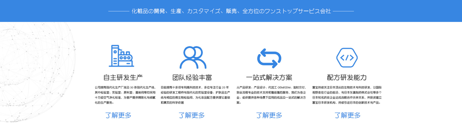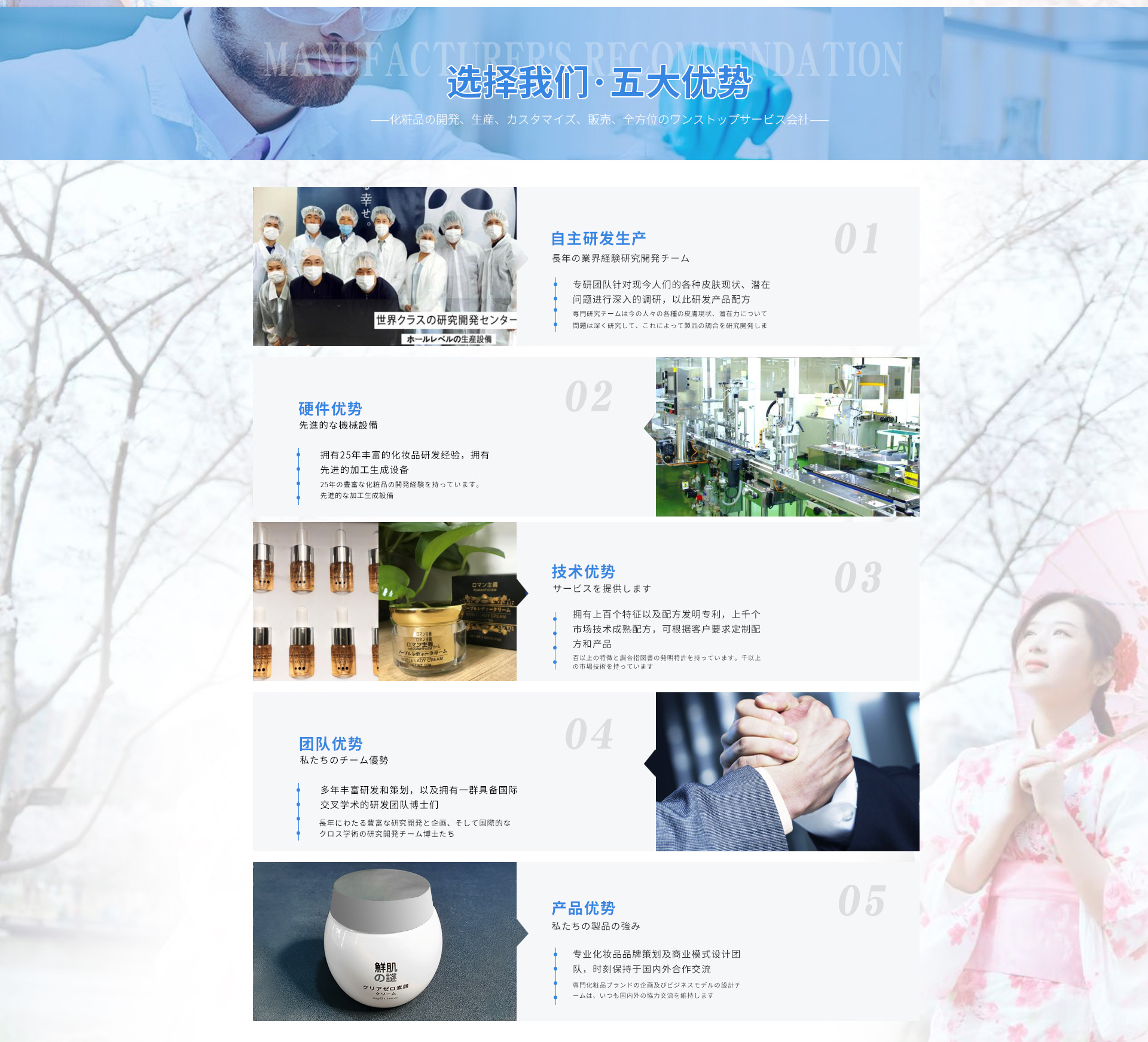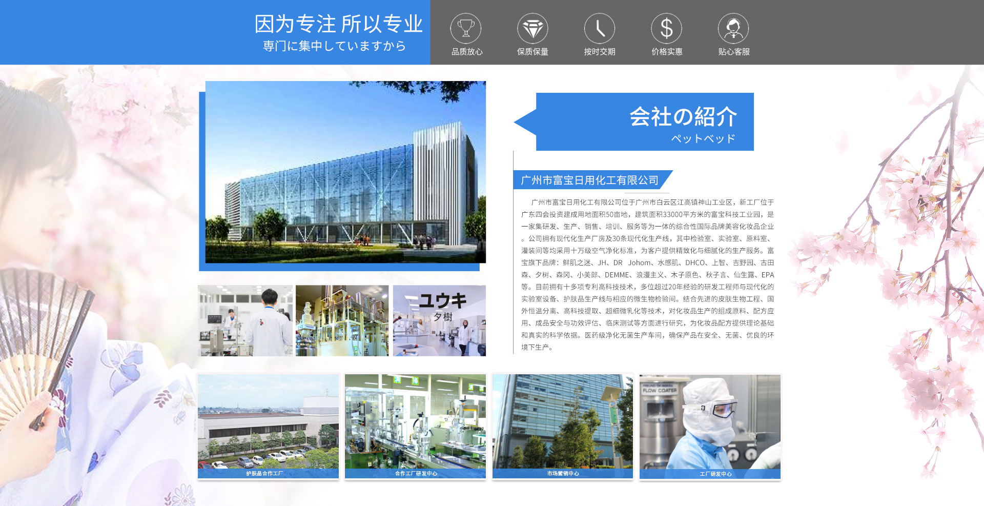 廣州市富寶日用化工有限公司位于廣州市白云區(qū)江高鎮(zhèn)神山工業(yè)區(qū),新工廠位于廣東四會(huì)投資建成用地面積50畝地,建筑面積33000平方米的富寶科技工業(yè)園,是一家集研發(fā)、生產(chǎn)、銷售、培訓(xùn)、服務(wù)等為一體的綜合性國(guó)際品牌美容化妝品企業(yè)。公司擁有現(xiàn)代化生產(chǎn)廠房及30條現(xiàn)代化生產(chǎn)線,其中檢驗(yàn)室、實(shí)驗(yàn)室、原料室、灌裝間等均采用十萬(wàn)級(jí)空氣凈化標(biāo)準(zhǔn),為客戶提供精致化與細(xì)膩化的生產(chǎn)服務(wù)。 目前擁有十多項(xiàng)專利高科技技術(shù),多位超過(guò)20年經(jīng)驗(yàn)的研發(fā)工程師與現(xiàn)代化的實(shí)驗(yàn)室設(shè)備、護(hù)膚品生產(chǎn)線與相應(yīng)的微生物檢驗(yàn)間。結(jié)合先進(jìn)的皮膚生物工程、國(guó)外恒溫分離、高科技提取、超細(xì)微乳化等技術(shù),對(duì)化妝品生產(chǎn)的組成原料、配方應(yīng)用、成品安全與功效評(píng)估、臨床測(cè)試等方面進(jìn)行研究,為化妝品配方提供理論基礎(chǔ)和真實(shí)的科學(xué)依據(jù)。醫(yī)藥級(jí)凈化無(wú)菌生產(chǎn)車間,確保產(chǎn)品在安全、無(wú)菌、優(yōu)良的環(huán)境下生產(chǎn)。 富寶持續(xù)關(guān)注日本頂尖的生物技術(shù)與科技研發(fā),以國(guó)際視野走在行業(yè)