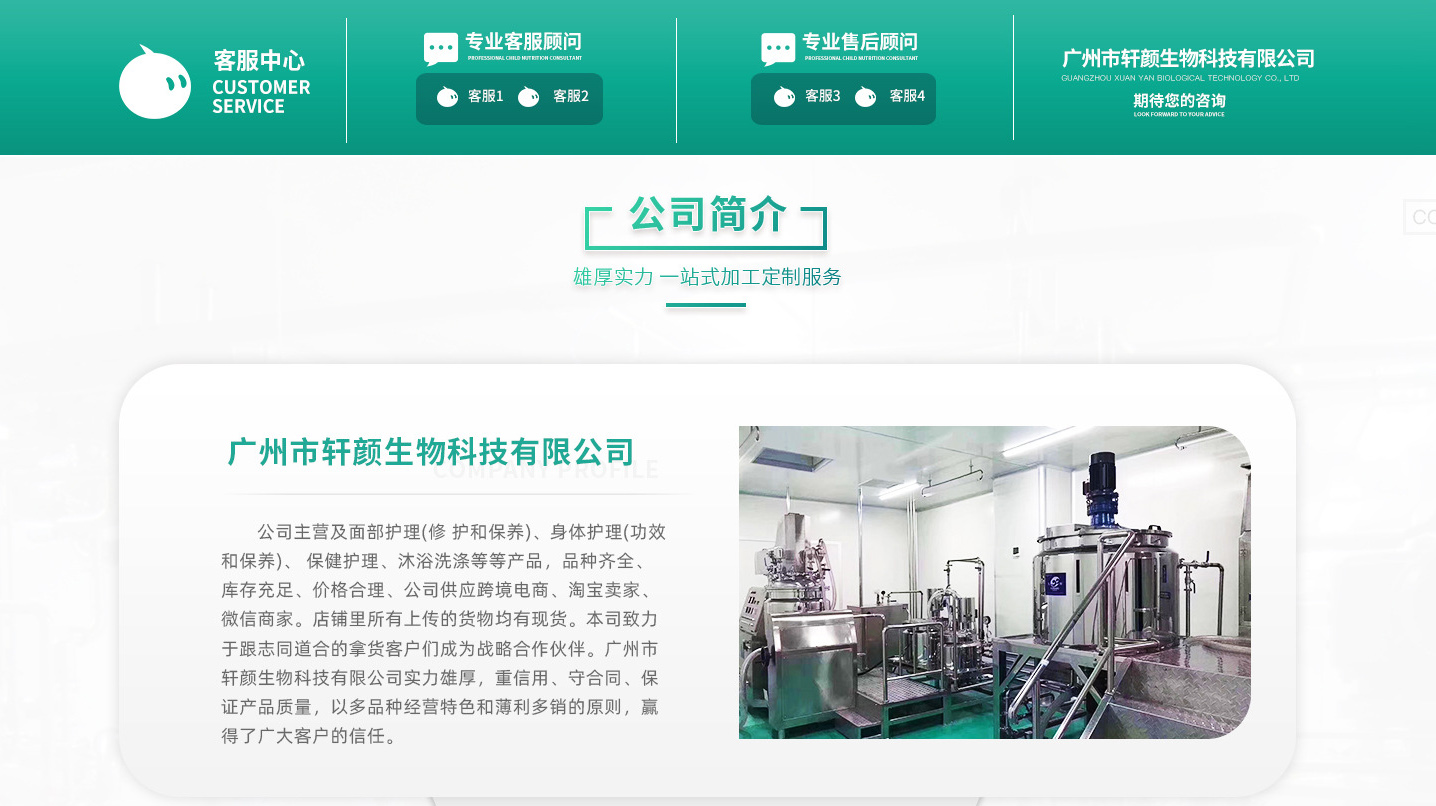 廣州市軒顏生物科技有限公司是一家集研發(fā)、實驗、生產(chǎn)為一體的專業(yè)化妝品企業(yè),是一家從事化妝品研發(fā)、生產(chǎn)、銷售、服務(wù)、OEM/ODM/OBM于一體的專業(yè)化的大型加工工廠,帝屬于廣州宸極生物科技旗下公司,硬件優(yōu)勢 ?1、生產(chǎn)環(huán)境:十萬級無塵凈化車間,萬級理化實驗室。2、生產(chǎn)設(shè)備:全新設(shè)備及最新的面膜機等。3、產(chǎn)品原料:全球十強原料供應(yīng)商指定供應(yīng)。4、新產(chǎn)品研發(fā):專業(yè)化的工程師團隊。5、生產(chǎn)質(zhì)量:萬級的理化實驗室,來料檢驗、半成品及成品檢驗、第三方檢驗。