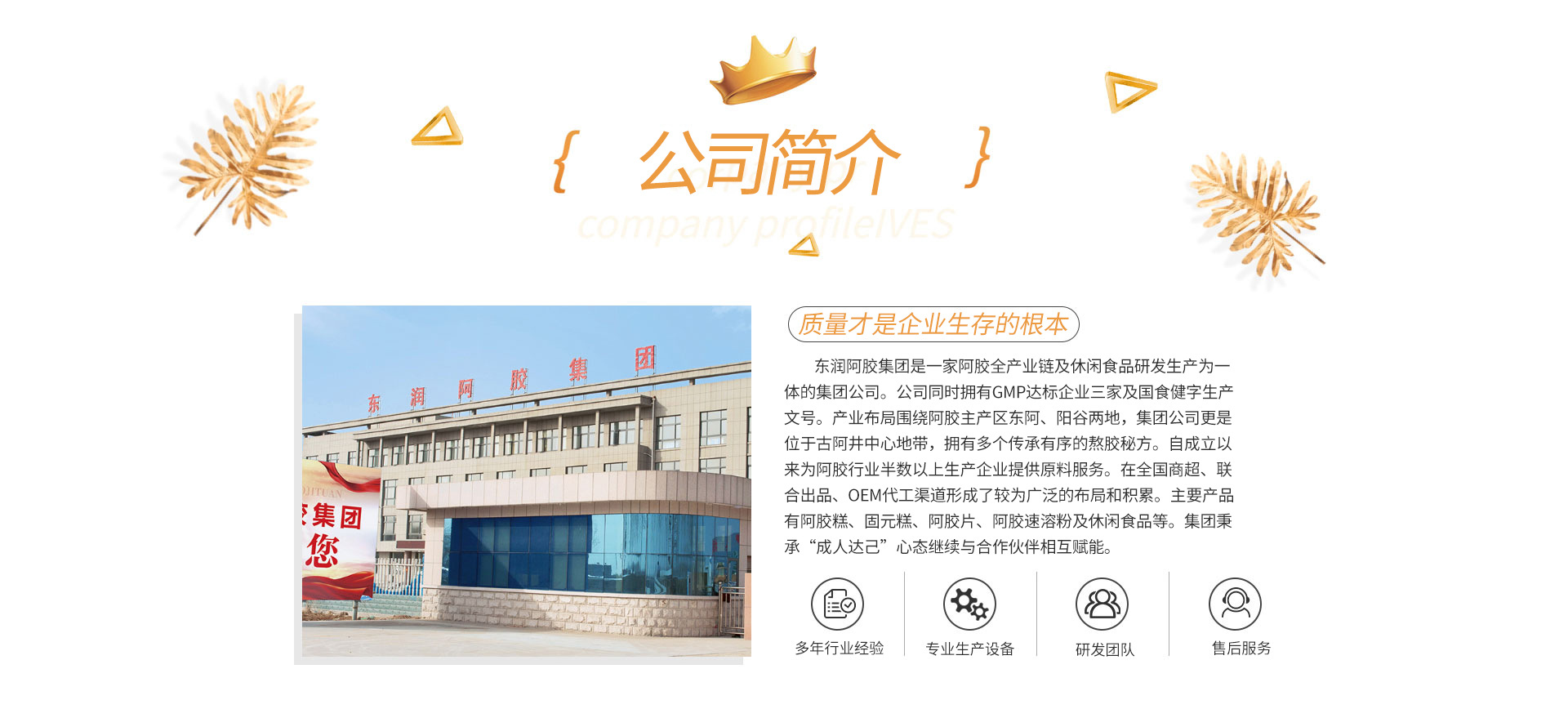 山東東潤阿膠集團,前身為山東東潤阿膠有限公司??傋再Y本2000萬元。2010年建廠,2014年企業(yè)改組為集團有限公司。同年,斥資2億擴建廠房,新廠房占地面積100畝。其中,辦公樓建筑面積為5000平方,單生產(chǎn)車間占地面積為9000平方,生產(chǎn)車間全部參照國家最新版GMP標準設計,車間內均是國家醫(yī)藥級的生產(chǎn)設備,采用現(xiàn)代化的醫(yī)藥生產(chǎn)流程,并配有專門的質量監(jiān)控系統(tǒng),全部符合醫(yī)藥保健行業(yè)生產(chǎn)標準。 東潤阿膠集團坐落于“泛東阿區(qū)”山東省聊城市阿城鎮(zhèn),唐宋時期的東阿縣治就在今天的阿城鎮(zhèn),因此阿城鎮(zhèn)又被稱為“古東阿”,這里是阿膠最古老的發(fā)源地,其阿膠文化底蘊深厚,有著傳承數(shù)千年的阿膠熬制古方。聞名中外、享譽古今的“古阿井”就位于集團附近的岳莊村。古阿井之水是熬治阿膠膠的關鍵所在,其水清冽甘甜,水質優(yōu)良,含有多種對人體有益的微量元素,這些微量元素與阿膠中的蛋白質、氨基酸結合形成有機鹽