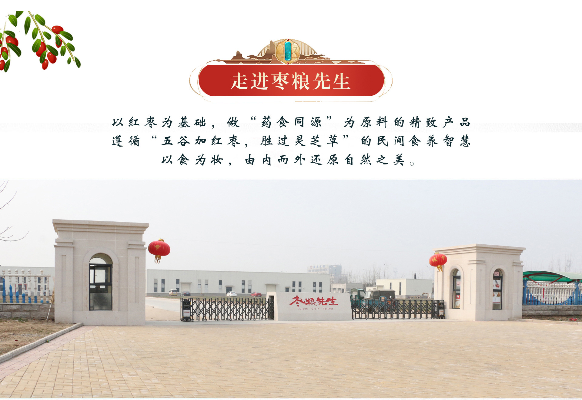 山東棗糧先生生物科技有限公司是一家以“精致”為原則,以紅棗為基礎(chǔ),做“藥食同源”為原料的,全產(chǎn)業(yè)鏈的,互聯(lián)網(wǎng)型,小而美的股份制企業(yè)。 公司始建于2015年1月,依托德州市百萬畝棗林資源,以及上千年的紅棗文化,以工業(yè)產(chǎn)業(yè)、農(nóng)業(yè)產(chǎn)業(yè)、互聯(lián)網(wǎng)產(chǎn)業(yè)和文化產(chǎn)業(yè)四大板塊為核心,規(guī)劃建設(shè)了現(xiàn)代棗制品加工中心、立體農(nóng)業(yè)(新疆和陵城區(qū))、養(yǎng)生文化園、互聯(lián)網(wǎng)運營平臺四大產(chǎn)業(yè),其中現(xiàn)代化食品加工中心、養(yǎng)生文化園、互聯(lián)網(wǎng)運營平臺等產(chǎn)業(yè)板塊正在籌建中。 作為中國食品行業(yè)的引領(lǐng)者,棗糧先生以“做精致的企業(yè),做精致的人”為愿景,以市場需求為導(dǎo)向,以互聯(lián)網(wǎng)的思維模式,致力于把公司打造成為中國健康零食領(lǐng)航品牌,公司立足紅棗,配伍小麥、玉米、核桃、花生、山楂等谷物,依據(jù)藥食同源的理論,結(jié)合中醫(yī)中草藥文化,創(chuàng)造性的提出“食妝”這一消費理念,運用以“食材護膚,以食為妝”,以內(nèi)養(yǎng)外的食療、食治、食補、食調(diào)的理念。