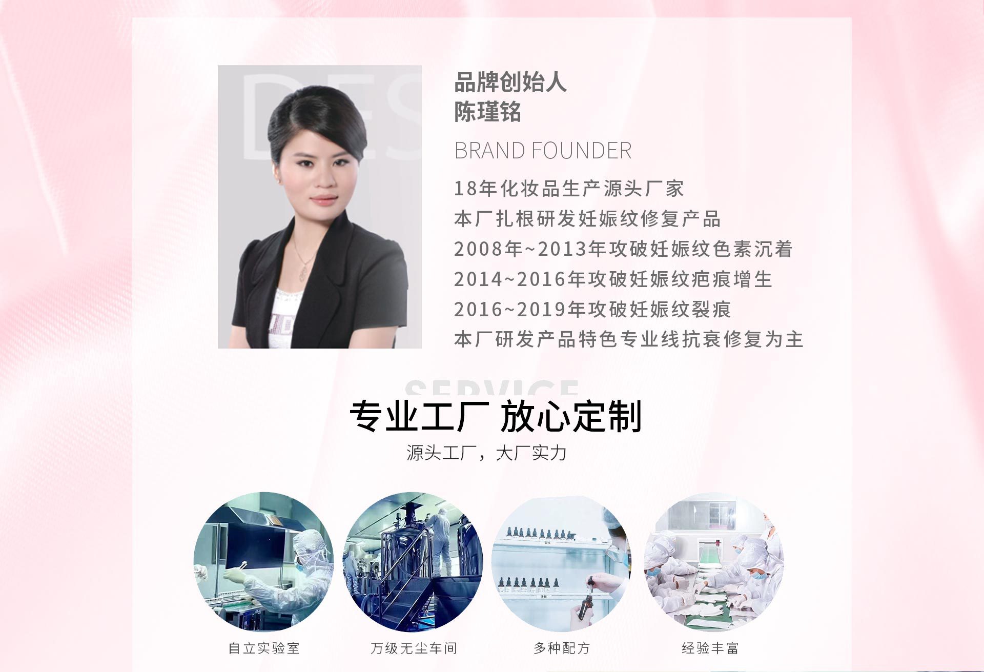 銘儷醫(yī)藥(廣州)有限公司是一家生物制藥以制藥的標(biāo)準(zhǔn)生產(chǎn)護(hù)膚品,本廠領(lǐng)先行業(yè)產(chǎn)品為 妊娠紋修復(fù)產(chǎn)品 眼霜、卸妝膏、原液、珍珠粉底液 修復(fù)激素臉產(chǎn)品為本廠特色,一直打造高端專業(yè)線,擁有完整、科學(xué)的質(zhì)量管理體系。銘儷醫(yī)藥(廣州)有限公司的誠信、實(shí)力和產(chǎn)品質(zhì)量獲得業(yè)界的認(rèn)可。歡迎各界朋友蒞臨參觀、指導(dǎo)和業(yè)務(wù)洽談。