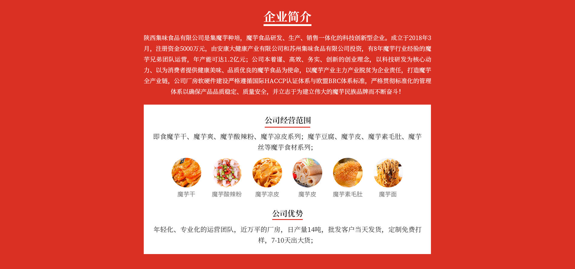 陜西集味食品有限公司是集魔芋種培,魔芋食品研發(fā)、生產(chǎn)、銷售一體化的科技創(chuàng) 新型企業(yè)。成立于2018年3月,注冊(cè)資金5000萬元,由安康大健康產(chǎn)業(yè)有限公司和 蘇州集味食品有限公司投資,有8年魔芋行業(yè)經(jīng)驗(yàn)的魔芋兄弟團(tuán)隊(duì)運(yùn)營(yíng),年產(chǎn)能可達(dá) 1.2億元;公司本著嚴(yán)謹(jǐn)、高效、務(wù)實(shí)、創(chuàng)新的創(chuàng)業(yè)理念,以科技研發(fā)為核心動(dòng)力、 以為消費(fèi)者提供健康美味、品質(zhì)優(yōu)良的魔芋食品為使命,以魔芋產(chǎn)業(yè)主力產(chǎn)業(yè)脫貧 為企業(yè)責(zé)任,打造魔芋全產(chǎn)業(yè)鏈,公司廠房軟硬件建設(shè)嚴(yán)格遵循國(guó)際HACCP認(rèn)證體 系與歐盟BRC體系標(biāo)準(zhǔn),嚴(yán)格貫徹標(biāo)準(zhǔn)化的管理體系以確保產(chǎn)品品質(zhì)穩(wěn)定、質(zhì)量安全, 并立志于為建立偉大的魔芋民族品牌而不斷奮斗! 公司地址:陜西省安康市漢濱區(qū)恒口示范區(qū)工業(yè)產(chǎn)業(yè)園區(qū)大道3號(hào)
