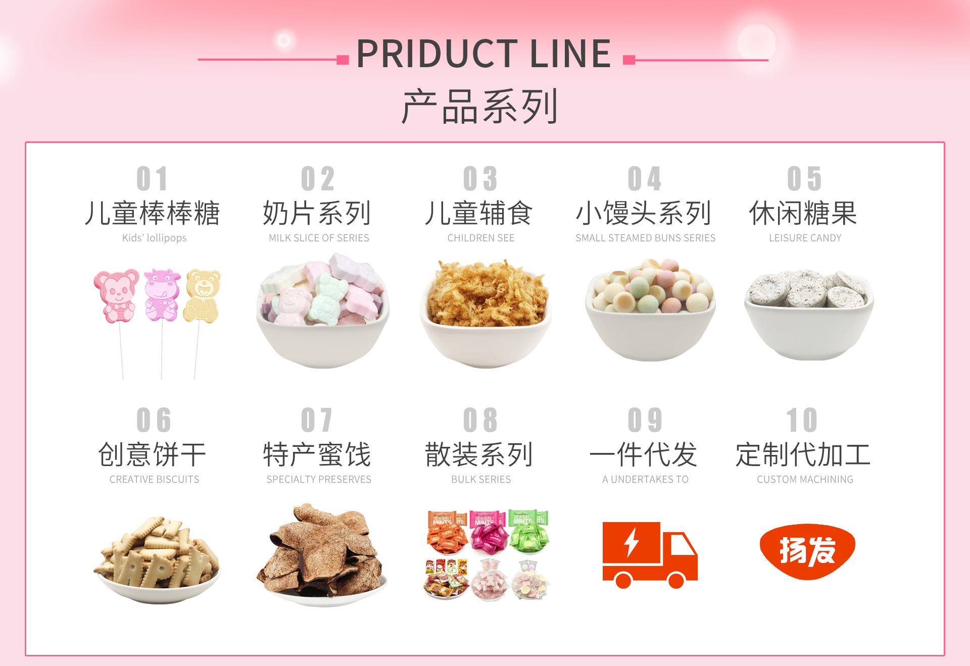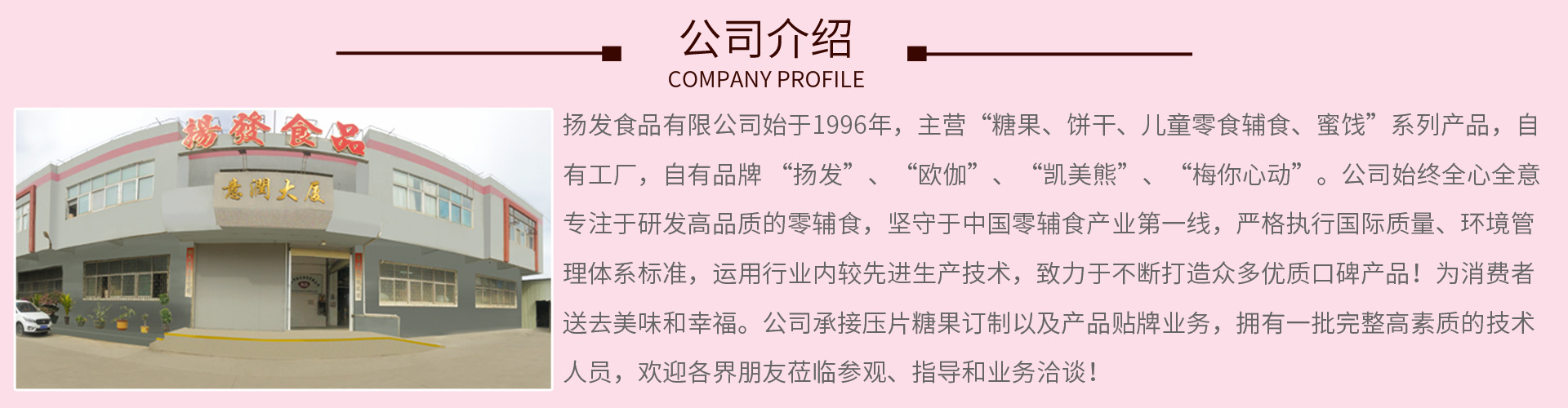 揚發(fā)食品有限公司始于1996年,主營“糖果、餅干、兒童零食輔食、蜜餞”系列產(chǎn)品,自有工廠,自有品牌 “揚發(fā)”、“歐伽”、“凱美熊”、“梅你心動”。公司始終全心全意專注于研發(fā)高品質(zhì)的零輔食,堅守于中國零輔食產(chǎn)業(yè)第一線,嚴格執(zhí)行國際質(zhì)量、環(huán)境管理體系標準,運用行業(yè)內(nèi)較先進生產(chǎn)技術(shù),致力于不斷打造眾多優(yōu)質(zhì)口碑產(chǎn)品!為消費者送去美味和幸福