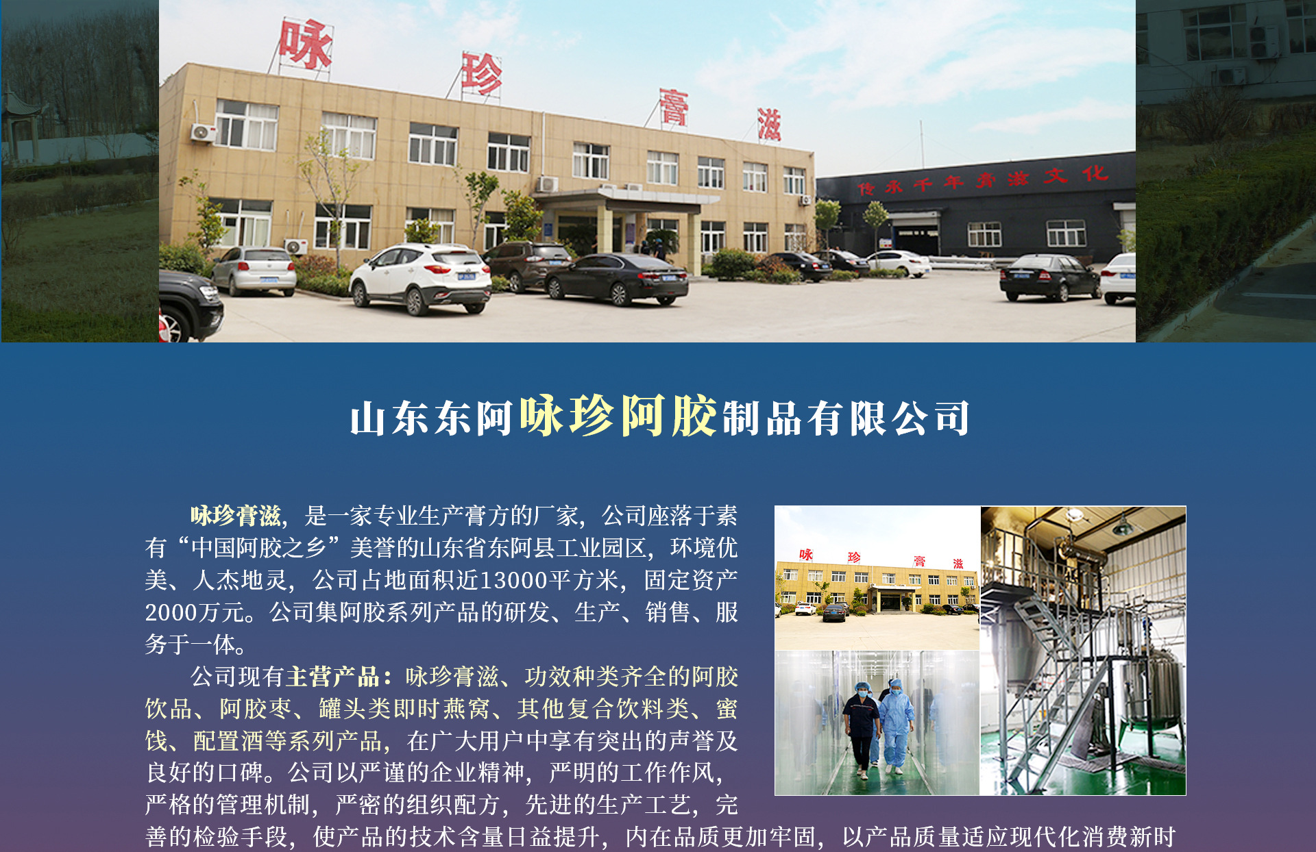 詠珍膏滋,是一家專業(yè)生產(chǎn)膏方的廠家,公司座落于素有“中國(guó)阿膠之鄉(xiāng)”美譽(yù)的山東省東阿縣工業(yè)園區(qū),環(huán)境優(yōu)美、人杰地靈,公司占地面積近13000平方米,固定資產(chǎn)2000萬(wàn)元。公司集阿膠系列產(chǎn)品的研發(fā)、生產(chǎn)、銷售、服務(wù)于一體。公司現(xiàn)有主導(dǎo)產(chǎn)品:詠珍膏滋、功效種類齊全的阿膠飲品、阿膠棗、罐頭類即時(shí)燕窩、其他復(fù)合飲料類、蜜餞、配置酒等系列產(chǎn)品,在廣大用戶中享有突出的聲譽(yù)及良好的口碑。公司以嚴(yán)謹(jǐn)?shù)钠髽I(yè)精神,嚴(yán)明的工作作風(fēng),嚴(yán)格的管理機(jī)制,嚴(yán)密的組織配方,先進(jìn)的生產(chǎn)工藝,完善的檢驗(yàn)手段,使產(chǎn)品的技術(shù)含量日益提升,內(nèi)在品質(zhì)更加牢固,以產(chǎn)品質(zhì)量適應(yīng)現(xiàn)代化消費(fèi)新時(shí)尚,滿足消費(fèi)者的需求,真正使消費(fèi)者買的放心,吃得安心。公司技術(shù)力量雄厚,工藝精湛。山東東阿詠珍阿膠制品有限公司,始終堅(jiān)持以傳承千年阿膠文化,服務(wù)人類健康事業(yè)為己任,始終堅(jiān)持“誠(chéng)信創(chuàng)業(yè),誠(chéng)信經(jīng)營(yíng)”的企業(yè)精神,加速發(fā)展,以種類齊全的產(chǎn)品,完善的服務(wù)
