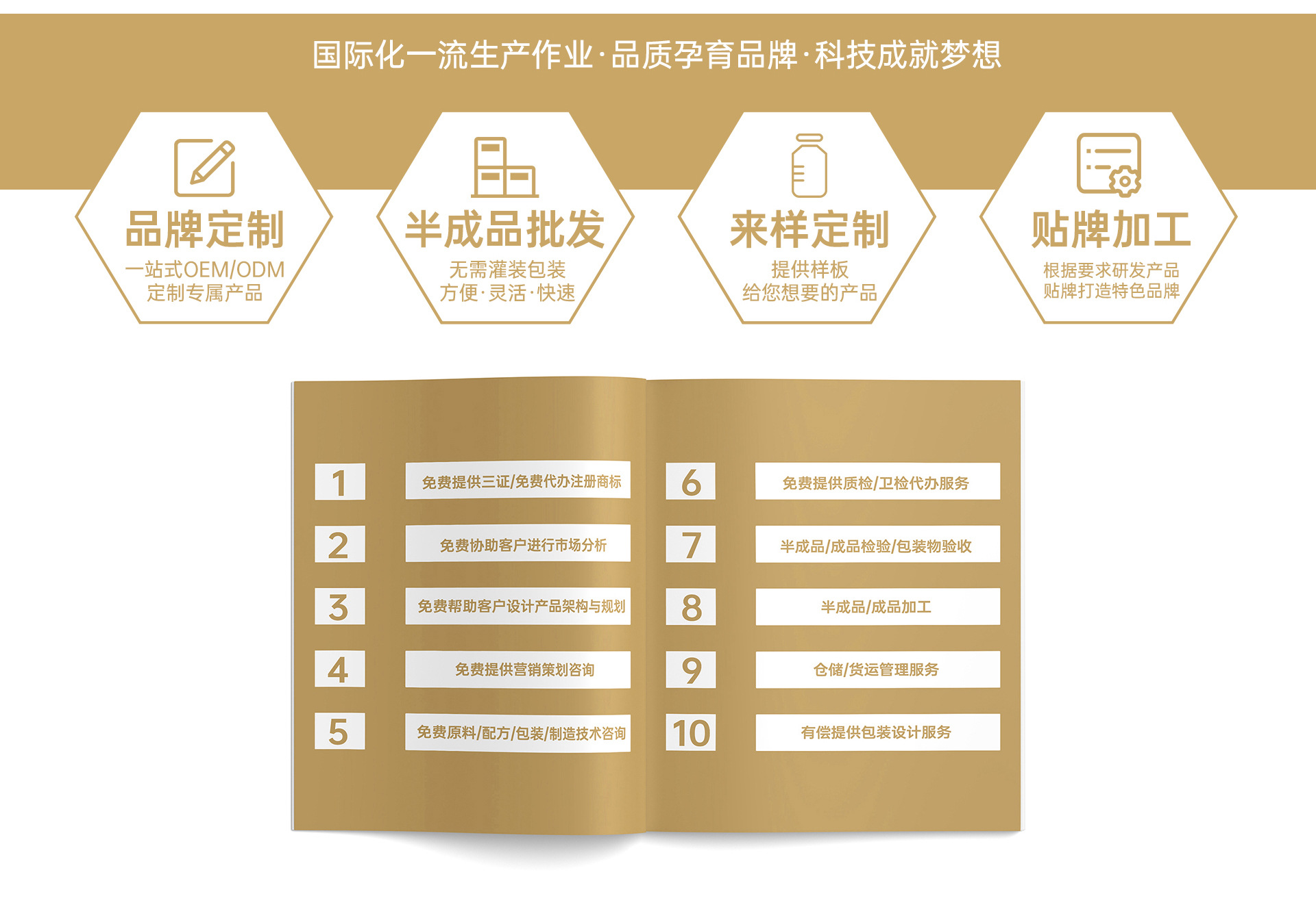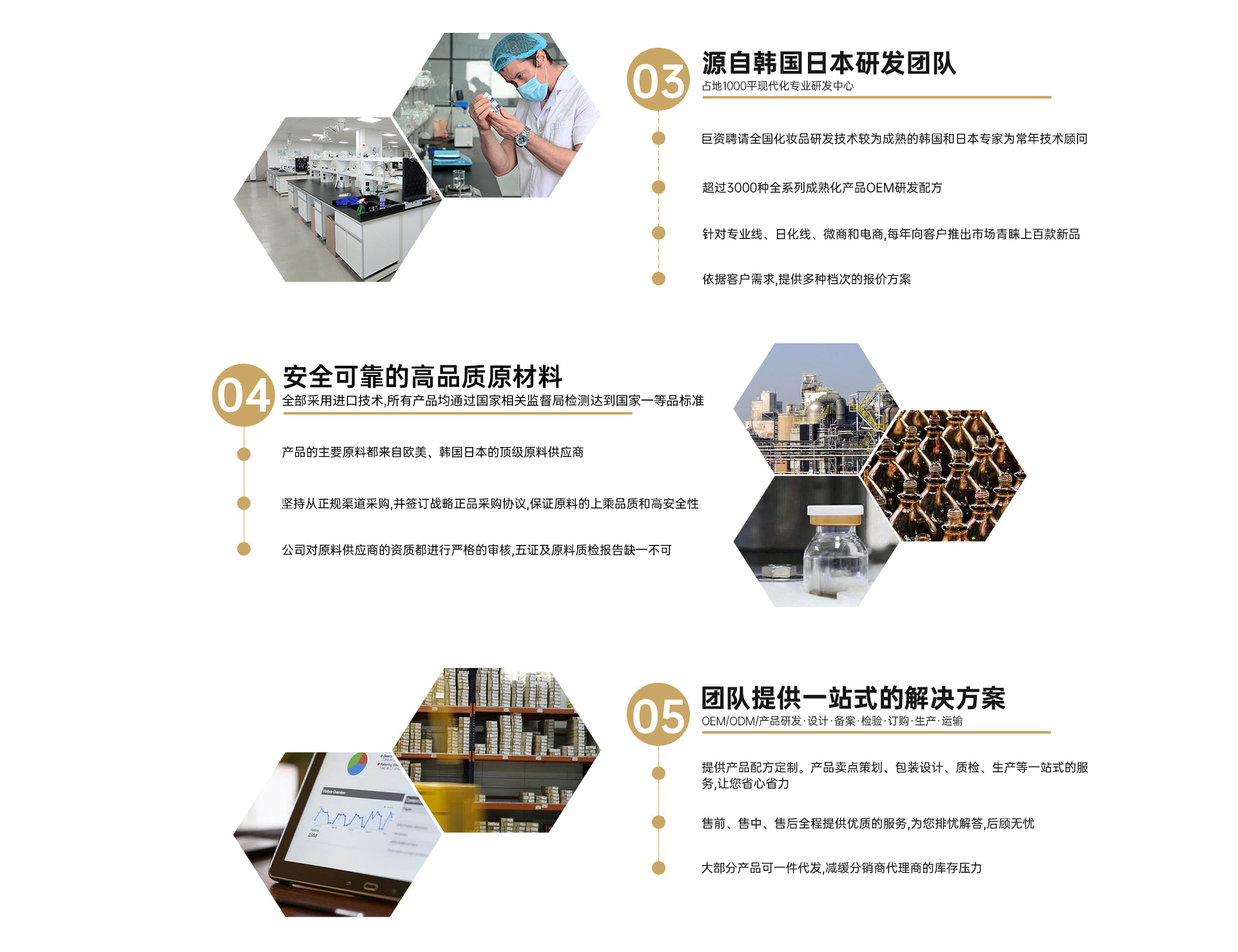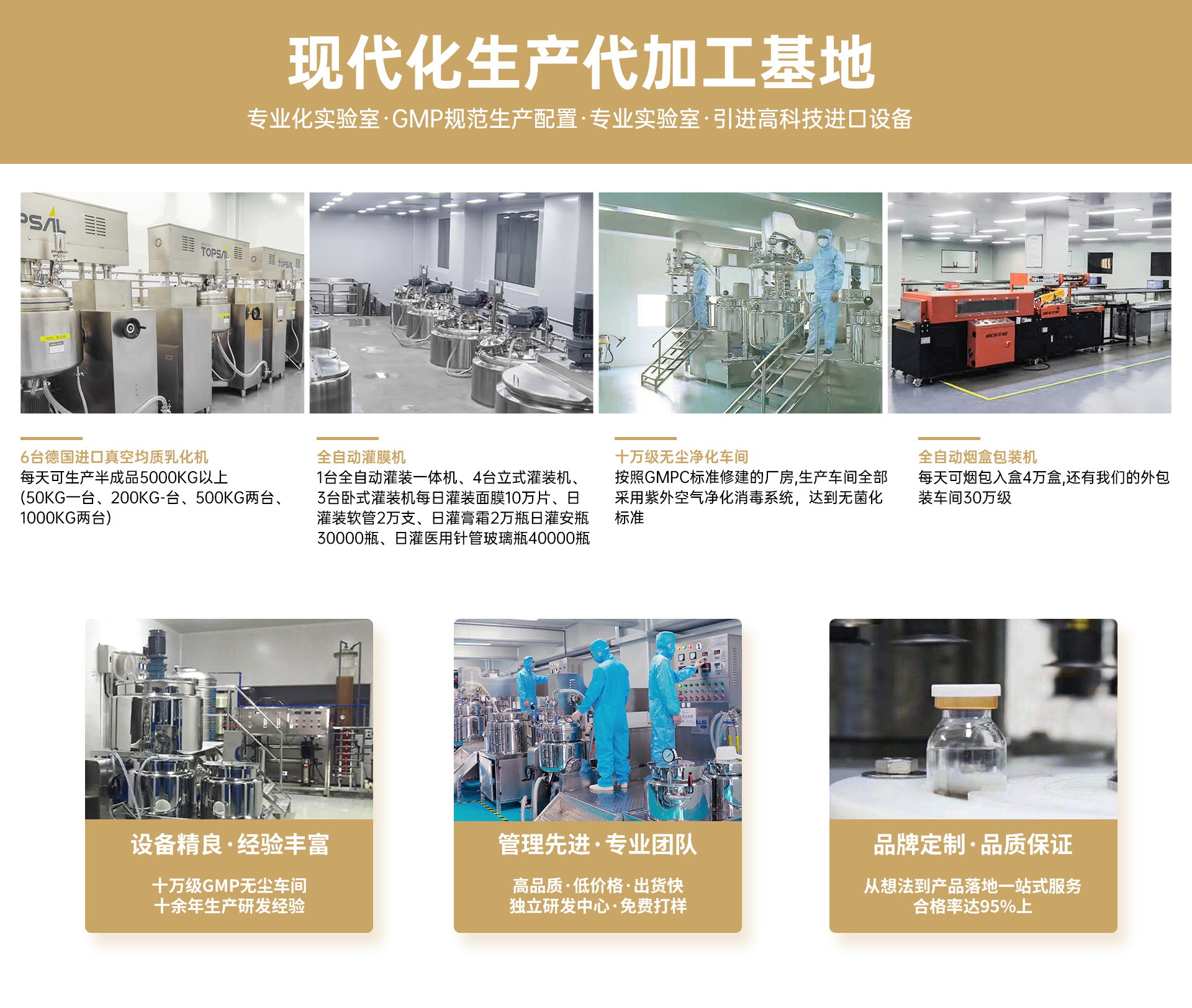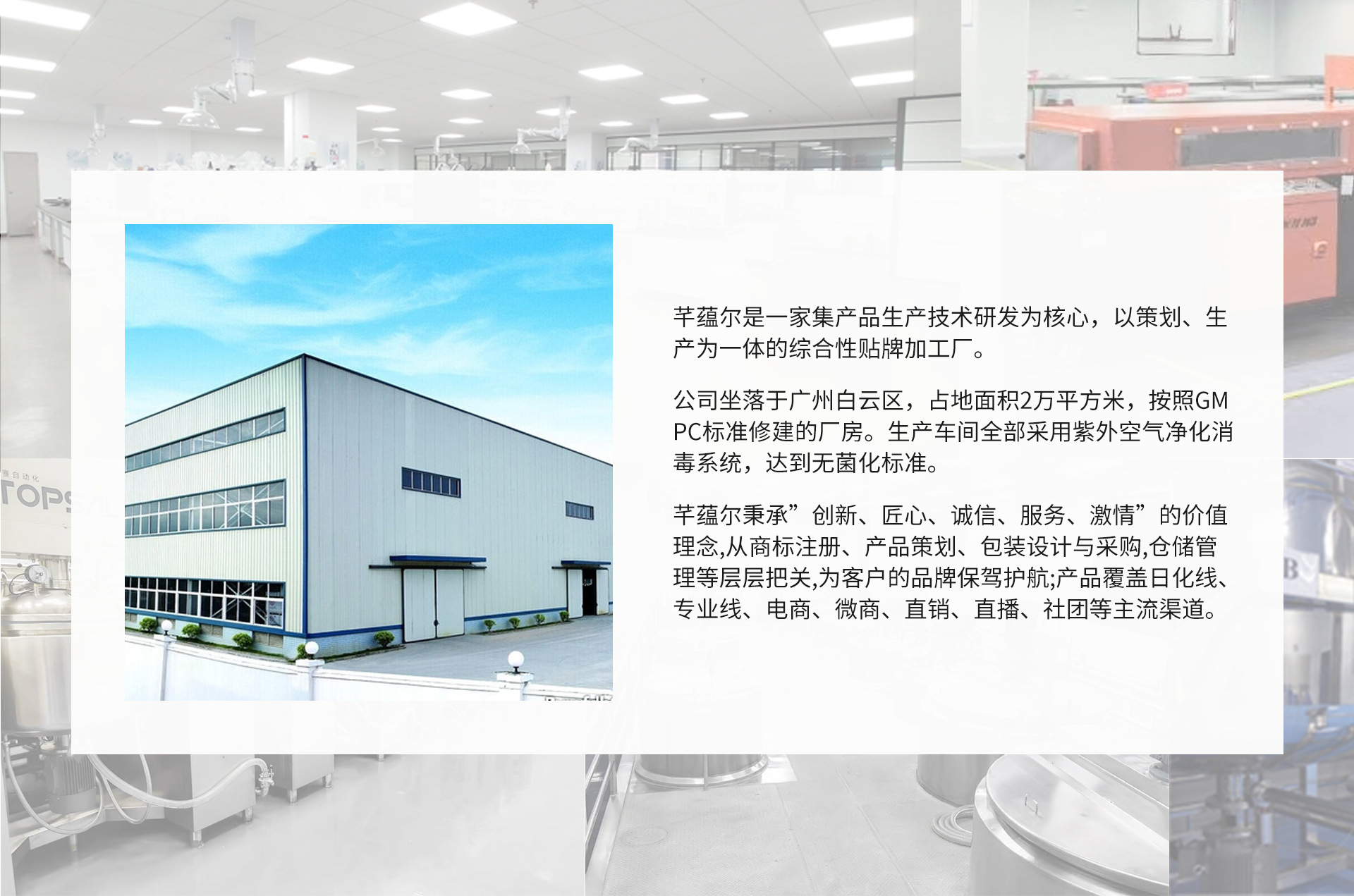芊蘊(yùn)爾是一家集產(chǎn)品生產(chǎn)技術(shù)研發(fā)為核心,以策劃、生 產(chǎn)為一體的綜合性貼牌加工廠。 公司坐落于廣州白云區(qū),占地面積2萬平方米,按照GM PC標(biāo)準(zhǔn)修建的廠房。生產(chǎn)車間全部采用紫外空氣凈化消 毒系統(tǒng),達(dá)到無菌化標(biāo)準(zhǔn)。 芊蘊(yùn)爾秉承”創(chuàng)新、匠心、誠信、服務(wù)、激情”的價值 理念,從商標(biāo)注冊、產(chǎn)品策劃、包裝設(shè)計與采購,倉儲管 理等層層把關(guān),為客戶的品牌保駕護(hù)航;產(chǎn)品覆蓋日化線、 專業(yè)線、電商、微商、直銷、直播、社團(tuán)等主流渠道。