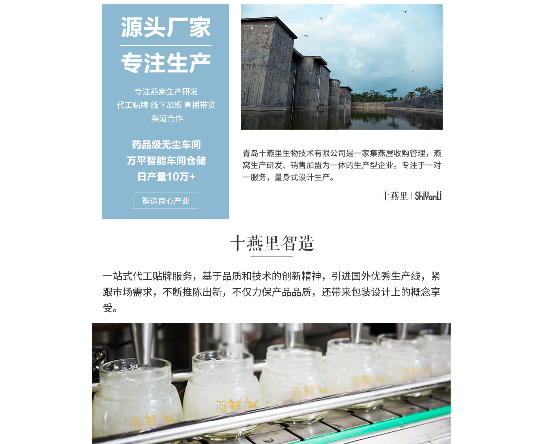 青島十燕里生物技術(shù)有限公司是燕窩、膠原蛋白飲等產(chǎn)品生產(chǎn)加工的公司,擁有完整、科學(xué)的質(zhì)量管理體系。青島十燕里生物技術(shù)有限公司的誠信、實(shí)力和產(chǎn)品質(zhì)量獲得業(yè)界的認(rèn)可。歡迎各界朋友蒞臨參觀、指導(dǎo)和業(yè)務(wù)洽談。