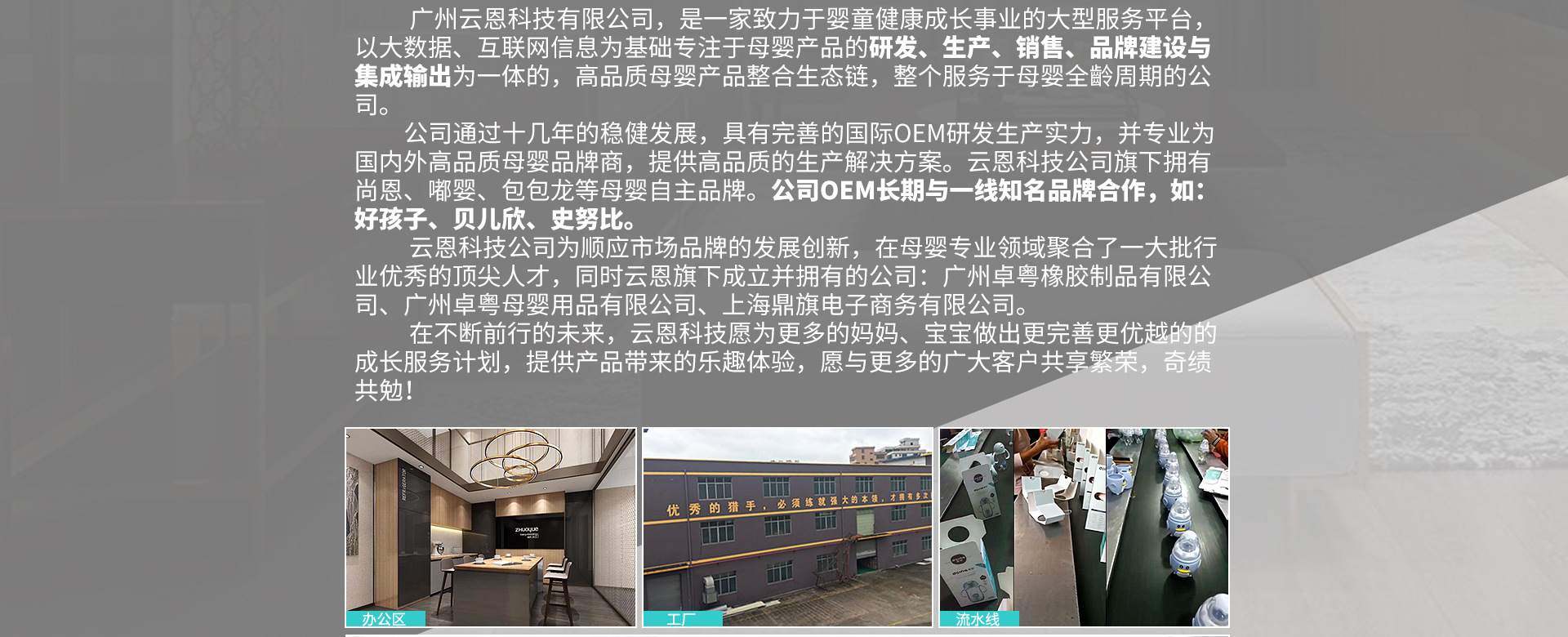 嘟嬰母嬰用品致力于發(fā)展嬰童健康成長(zhǎng)事業(yè),專注于母嬰產(chǎn)品的研發(fā),生產(chǎn),銷售,品牌建設(shè)與集成輸出于一體的.高端母嬰產(chǎn)品整合生態(tài)鏈. 產(chǎn)品涉及到嬰幼兒成長(zhǎng)所需產(chǎn)品,奶瓶系列,奶嘴系列,水杯系列,輔食系列,清潔用品等等產(chǎn)品。提供高品質(zhì)的母嬰產(chǎn)品,是我們一貫的宗旨.