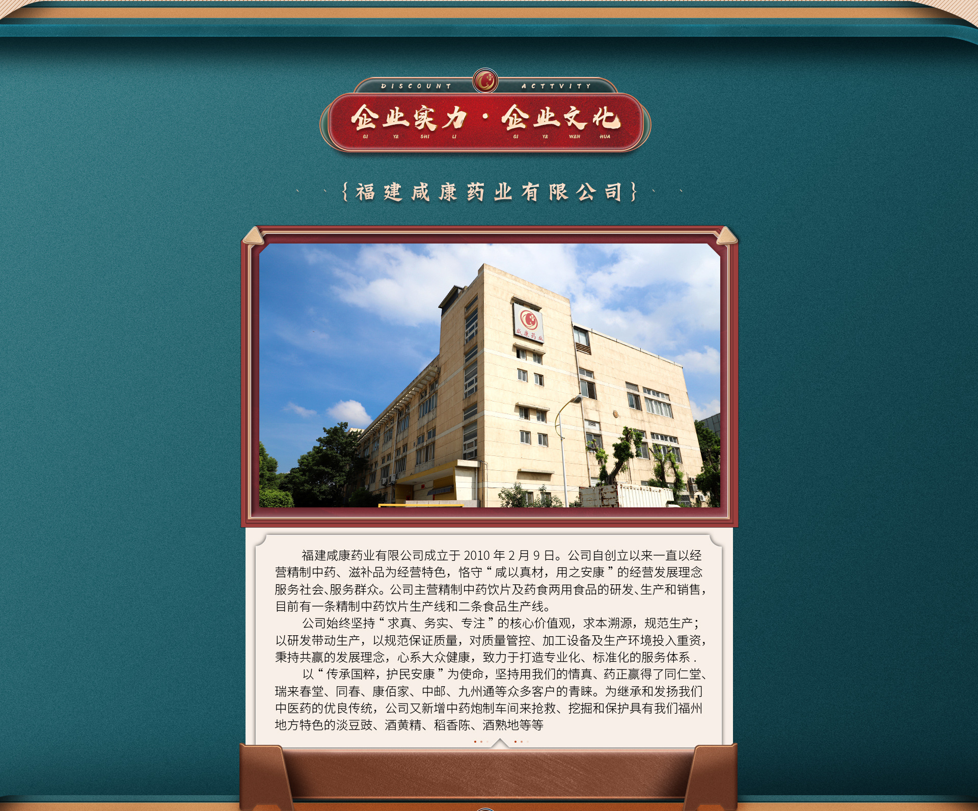 福建咸康藥業(yè)有限公司成立于2010年2月9日。公司自創(chuàng) 立以來- - -直以經(jīng)營精制中藥、滋補品為經(jīng)營特色,恪守“咸以真材, 用之安康”的經(jīng)營發(fā)展理念服務(wù)社會、服務(wù)群眾。公司主營精制 中藥飲片及藥食兩用食品的研發(fā)、生產(chǎn)和銷售,目前有一條精制 中藥飲片生產(chǎn)線和二條食品生產(chǎn)線。 公司始終堅持“求真、務(wù)實、專注”的核心價值觀,求本溯源, 規(guī)范生產(chǎn);以研發(fā)帶動生產(chǎn),以規(guī)范保證質(zhì)量,對質(zhì)量管控、加 工設(shè)備及生產(chǎn)環(huán)境投入重資,秉持共贏的發(fā)展理念,心系大眾, 致力于打造專業(yè)化、標準化的服務(wù)體系. 以“傳承國粹,護民安康”為使命,堅持用我們的情真、藥 正贏得了同仁堂、瑞來春堂、同春、康佰家、中郵、九州通等眾 多客戶的青睞。為繼承和發(fā)揚我們中醫(yī)藥的優(yōu)良傳統(tǒng),公司又新 增中藥炮制車間來搶救、挖掘和保護具有我們福州地方特色的淡 豆豉、酒黃精、稻香陳、酒熟地等等
