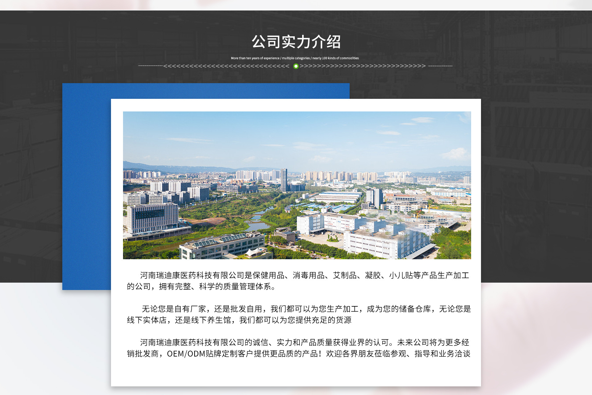 河南瑞迪康醫(yī)藥科技有限公司是保健用品、消毒用品、艾制品、凝膠、小兒貼等產(chǎn)品專業(yè)生產(chǎn)加工的公司,擁有完整、科學(xué)的質(zhì)量管理體系。河南瑞迪康醫(yī)藥科技有限公司的誠信、實力和產(chǎn)品質(zhì)量獲得業(yè)界的認可。歡迎各界朋友蒞臨參觀、指導(dǎo)和業(yè)務(wù)洽談。