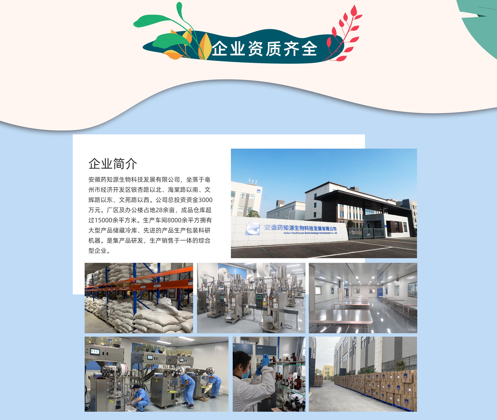 安徽藥知源生物科技發(fā)展有限公司,坐落于亳州市經(jīng)濟(jì)開發(fā)區(qū)銀杏。公司總投資資金3000萬元。廠區(qū)及辦公樓占地28余畝,成品倉庫超過15000余平方米。生產(chǎn)車間8000余平方擁有大型產(chǎn)品儲藏冷庫、先進(jìn)的產(chǎn)品生產(chǎn)包裝科研機(jī)器。是集產(chǎn)品研發(fā),生產(chǎn)銷售于一體的綜合型企業(yè)。公司前身為“亳州市藥知源花茶有限公司