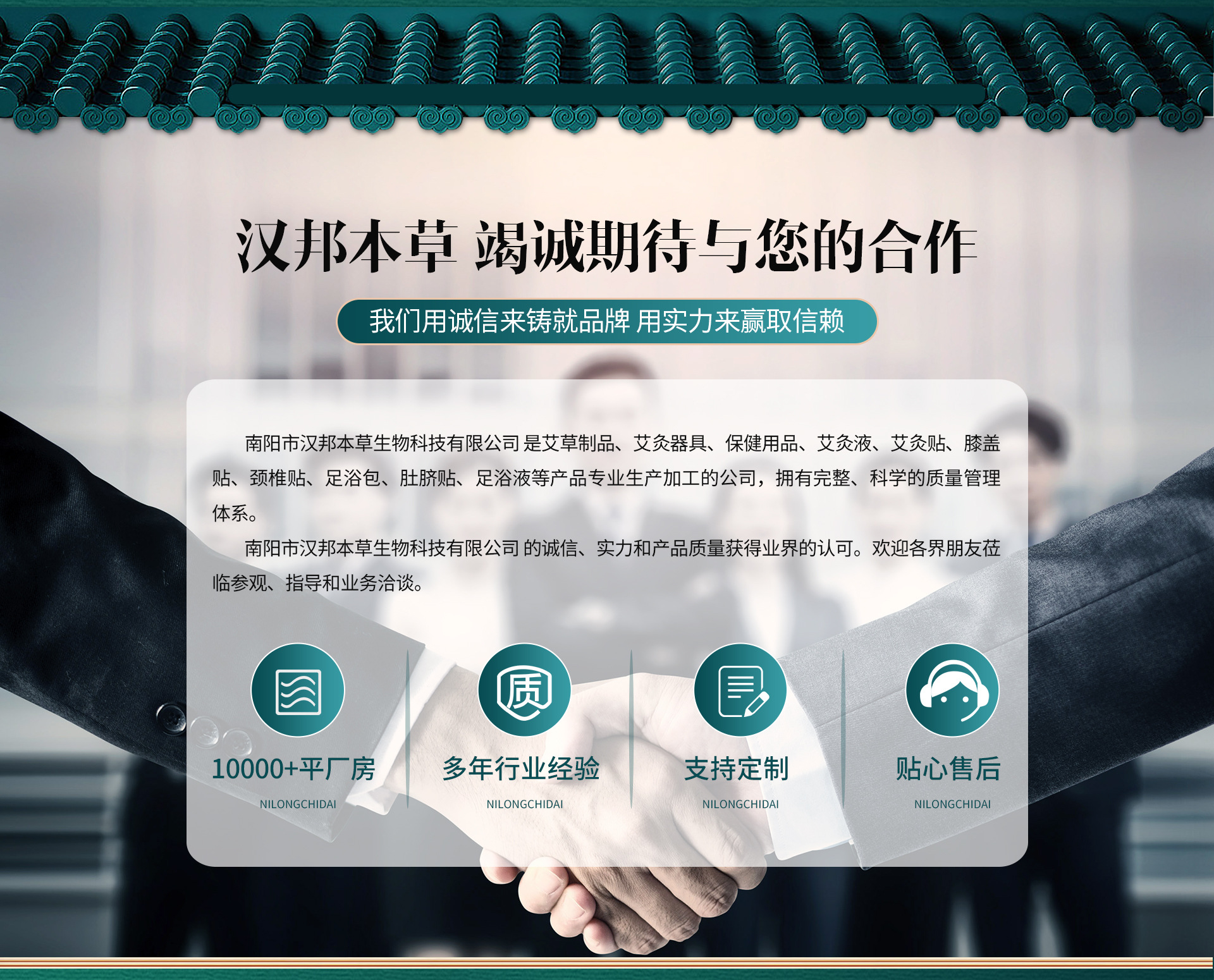 南陽漢邦本草生物有限公司坐落于醫(yī)生故里河南·南陽,是經(jīng)營艾草貼生產(chǎn)源頭廠家,集艾條生產(chǎn)、產(chǎn)品研制開發(fā)、艾制品OEM、ODM定制加工、等多重能力為一體的艾制品廠家,擁有完整、科學(xué)的質(zhì)量管理體系。 貨源穩(wěn)定,售后無憂!量大優(yōu)惠,高品質(zhì)一手貨源超低價(jià),讓您價(jià)格質(zhì)量雙重滿意!可免費(fèi)發(fā)樣品再定制,歡迎全國各地商家新老朋友實(shí)地來廠參觀考察!