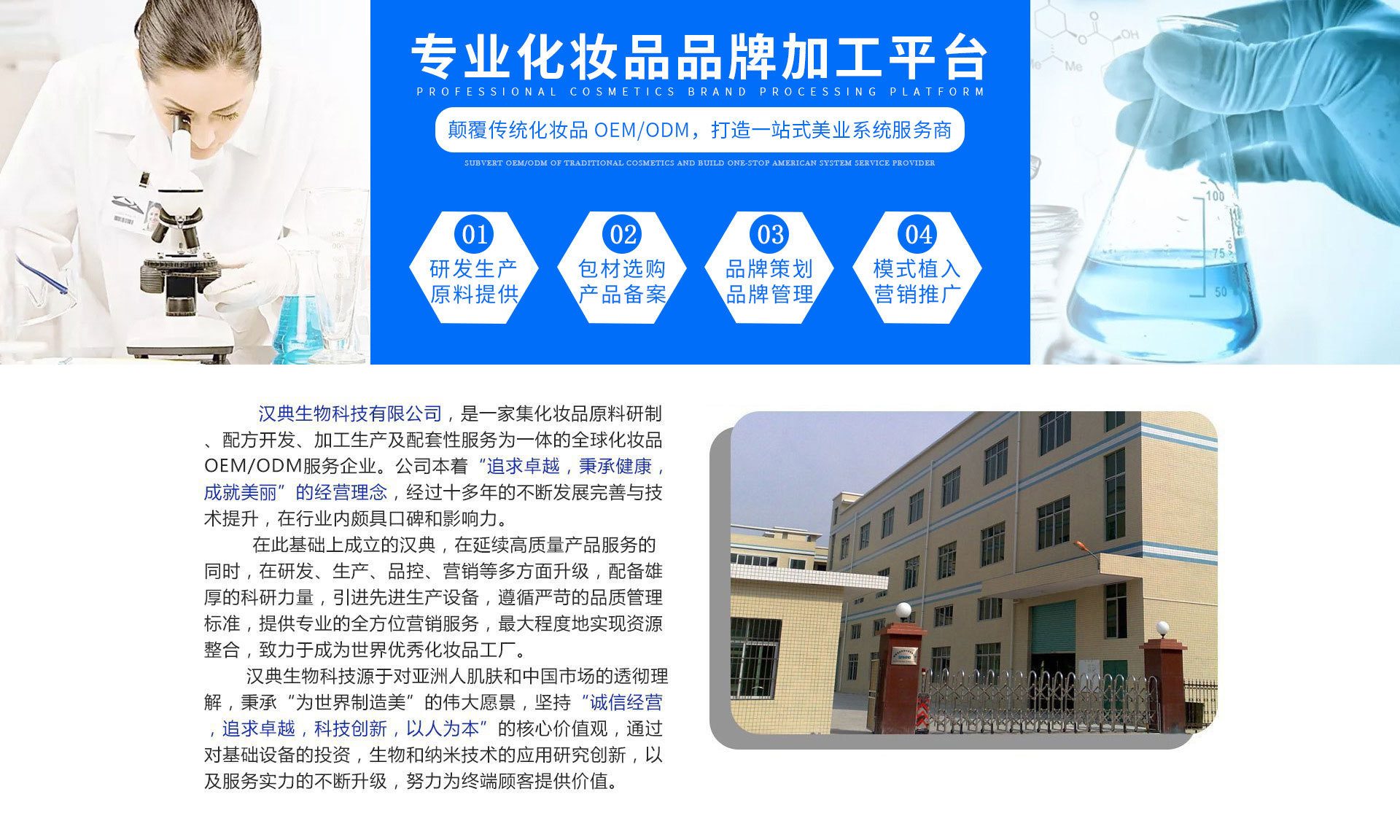漢典生物科技有限公司,是一家集化妝品原料研制配方開發(fā)、加工生產(chǎn)及配套性服務(wù)為一體的全球化妝品 OEM/ODM服務(wù)企業(yè)。公司本著“追求卓越,秉承健康成就美麗”的經(jīng)營理念,經(jīng)過十多年的不斷發(fā)展完善與技術(shù)提升,在行業(yè)內(nèi)頗具口碑和影響力。 在此基礎(chǔ)上成立的漢典,在延續(xù)高質(zhì)量產(chǎn)品服務(wù)的同時,在研發(fā)、生產(chǎn)、品控、營銷等多方面升級,配備雄厚的科研力量,引進(jìn)先進(jìn)生產(chǎn)設(shè)備,遵循嚴(yán)苛的品質(zhì)管理標(biāo)準(zhǔn),提供專業(yè)的全方位營銷服務(wù),最大程度地實(shí)現(xiàn)資源整合,致力于成為世界優(yōu)秀化妝品工廠 漢典生物科技源于對亞洲人肌膚和中國市場的透徹理解,秉承“為世界制造美”的偉大愿景,堅(jiān)持“誠信經(jīng)營,追求卓越,科技創(chuàng)新,以人為本”的核心價值觀,通過對基礎(chǔ)設(shè)備的投資,生物和納米技術(shù)的應(yīng)用研究創(chuàng)新,以及服務(wù)實(shí)力的不斷升級,努力為終端顧客提供價值。