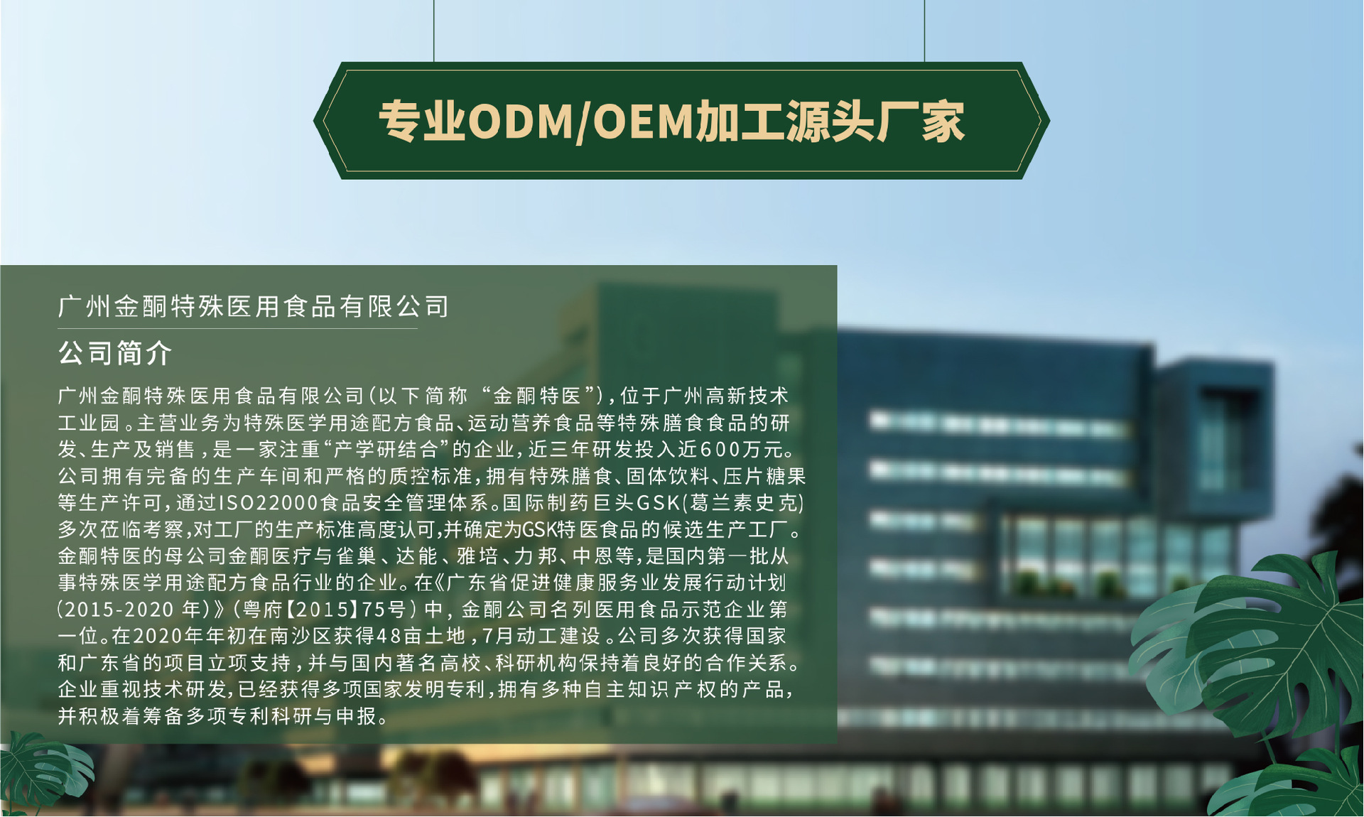 廣州金酮特殊醫(yī)用食品有限公司(原名:廣州施健生物科技有限公司)商務(wù)區(qū)位于廣州市天河區(qū),工廠建于廣州市羅崗區(qū)科學(xué)城。我公司長期致力于健康產(chǎn)業(yè)的科研、代加工、原料銷售。獲得了“廣東省政府75號文健康服務(wù)行動(dòng)計(jì)劃:醫(yī)用食品示范企業(yè)第一位”“綠動(dòng)2011中國經(jīng)濟(jì)最具發(fā)展?jié)摿ζ髽I(yè)”、當(dāng)選“中國食品科學(xué)技術(shù)學(xué)會(huì)營養(yǎng)支持委員會(huì)理事單位”、“營養(yǎng)食品設(shè)計(jì)獎(jiǎng)最佳設(shè)計(jì)單位”。施健公司多次獲得國家和廣東省的項(xiàng)目立項(xiàng)支持,并與國內(nèi)著名高校、科研機(jī)構(gòu)保持著良好的合作關(guān)系。企業(yè)重視技術(shù)研發(fā),已經(jīng)獲得十多項(xiàng)國家發(fā)明專利,擁有多種自主知識產(chǎn)權(quán)的產(chǎn)品,并積極著籌備多項(xiàng)專利科研與申報(bào)。