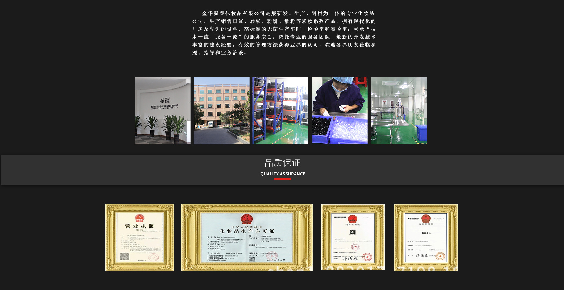 浙江凝?;瘖y品有限公司是集研發(fā)、生產(chǎn)、銷售為一體的專業(yè)化妝品公司,生產(chǎn)銷售口紅、唇彩、粉餅、散粉等彩妝系列產(chǎn)品。擁有現(xiàn)代化的廠房及先進(jìn)的設(shè)備、高標(biāo)準(zhǔn)的無(wú)菌生產(chǎn)車間、檢驗(yàn)室和實(shí)驗(yàn)室;秉承“技術(shù)一流、服務(wù)一流”的服務(wù)宗旨,依托專業(yè)的服務(wù)團(tuán)隊(duì)、最新的開發(fā)技術(shù)、豐富的建設(shè)經(jīng)驗(yàn),有效的管理方法獲得業(yè)界的認(rèn)可。歡迎各界朋友蒞臨參觀、指導(dǎo)和業(yè)務(wù)洽談。