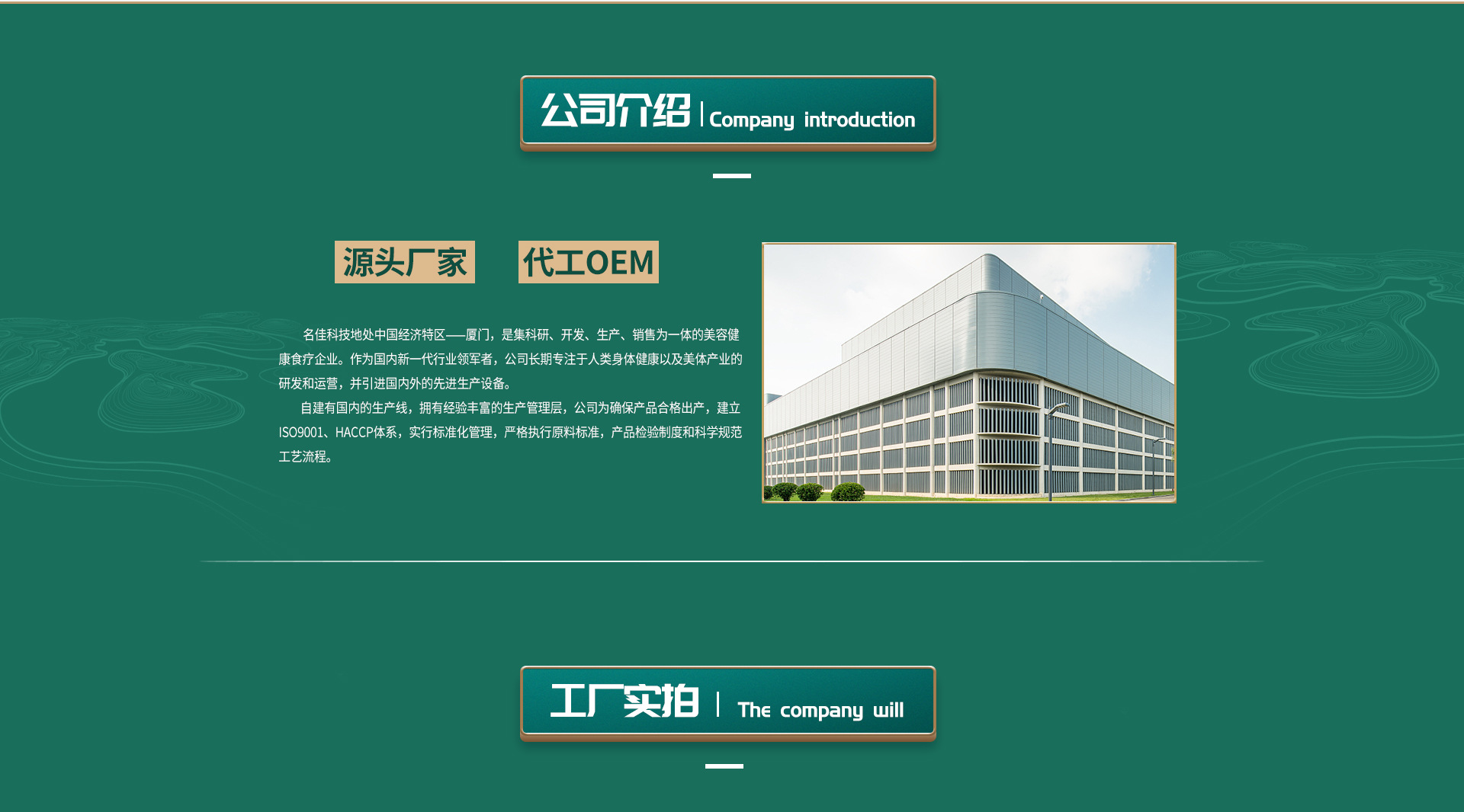 名佳科技地處中國經(jīng)濟(jì)特區(qū)——廈門,是集科研、開發(fā)、生產(chǎn)、銷售為一體的美容健康食療企業(yè)。作為國內(nèi)新一代行業(yè)領(lǐng)軍者,公司長期專注于人類身體健康以及美體產(chǎn)業(yè)的研發(fā)和運(yùn)營,并引進(jìn)國內(nèi)外的先進(jìn)生產(chǎn)設(shè)備;自建有國內(nèi)的生產(chǎn)線,擁有經(jīng)驗(yàn)豐富的生產(chǎn)管理層,公司為確保產(chǎn)品合格出產(chǎn),建立ISO9001、HACCP體系,實(shí)行標(biāo)準(zhǔn)化管理,嚴(yán)格執(zhí)行原料標(biāo)準(zhǔn),產(chǎn)品檢驗(yàn)制度和科學(xué)規(guī)范工藝流程。
