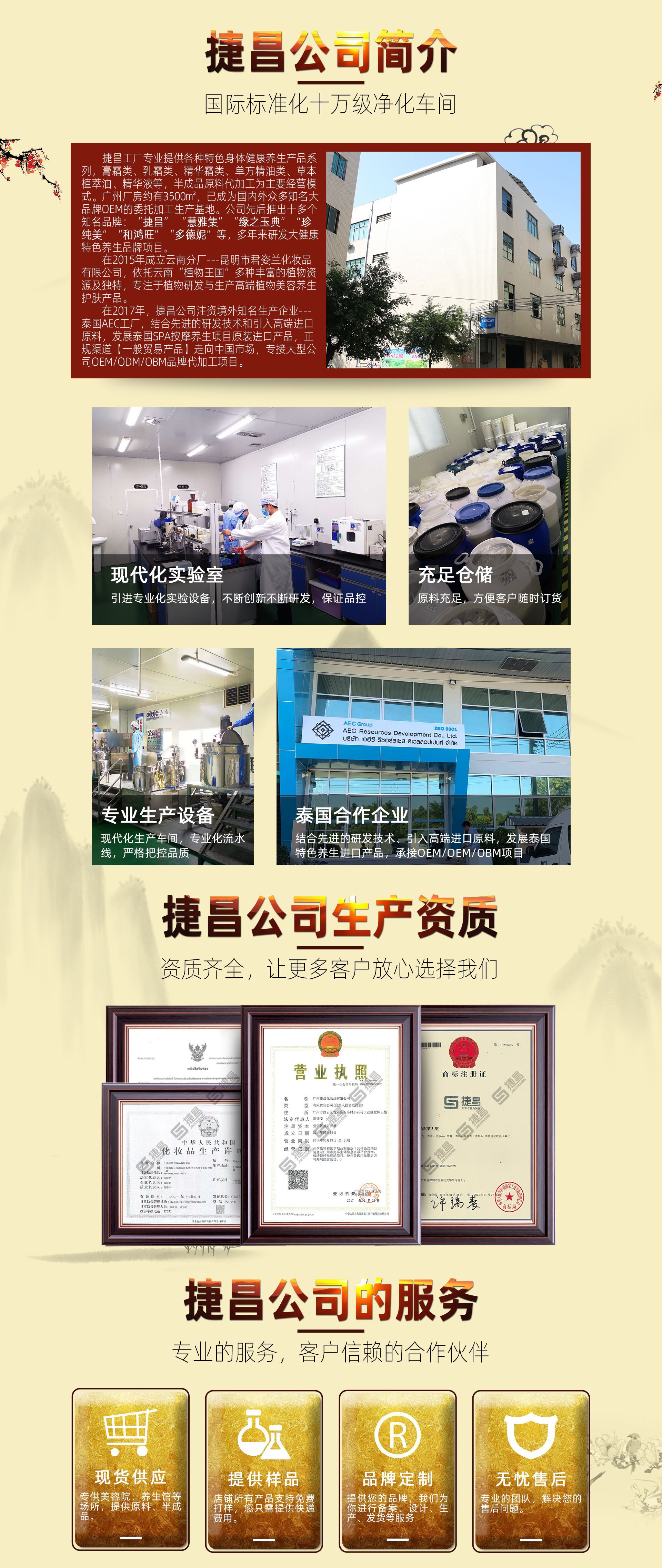 本公司一直提倡以“仁、義、禮、智、信、廉”的人文精神作為經(jīng)營準(zhǔn)則。工廠專業(yè)提供各種特色身體健康養(yǎng)生產(chǎn)品系列,膏霜類、乳霜類、精華霜類、單方精油類、草本植萃油、精華液等,半成品原料代加工為主要經(jīng)營模式,在國內(nèi)創(chuàng)辦生產(chǎn)企業(yè)——廣州捷昌化妝品有限公司,廠房約有4000㎡,已成為國內(nèi)外眾多知名大品牌OEM的委托加工生產(chǎn)基地。隨著膏霜乳類、精油類、植萃油、精華液等特色項(xiàng)目在國內(nèi)市場的蓬勃發(fā)展,公司先后推出十多個(gè)知名品牌:“捷昌” “慧雅集”“緣之玉典”“珍純美”“和鴻旺”“多德妮”等,多年來研發(fā)大健康特色養(yǎng)生品牌項(xiàng)目。產(chǎn)以安全效優(yōu)的口碑得到廣大消費(fèi)者的高度評價(jià)。