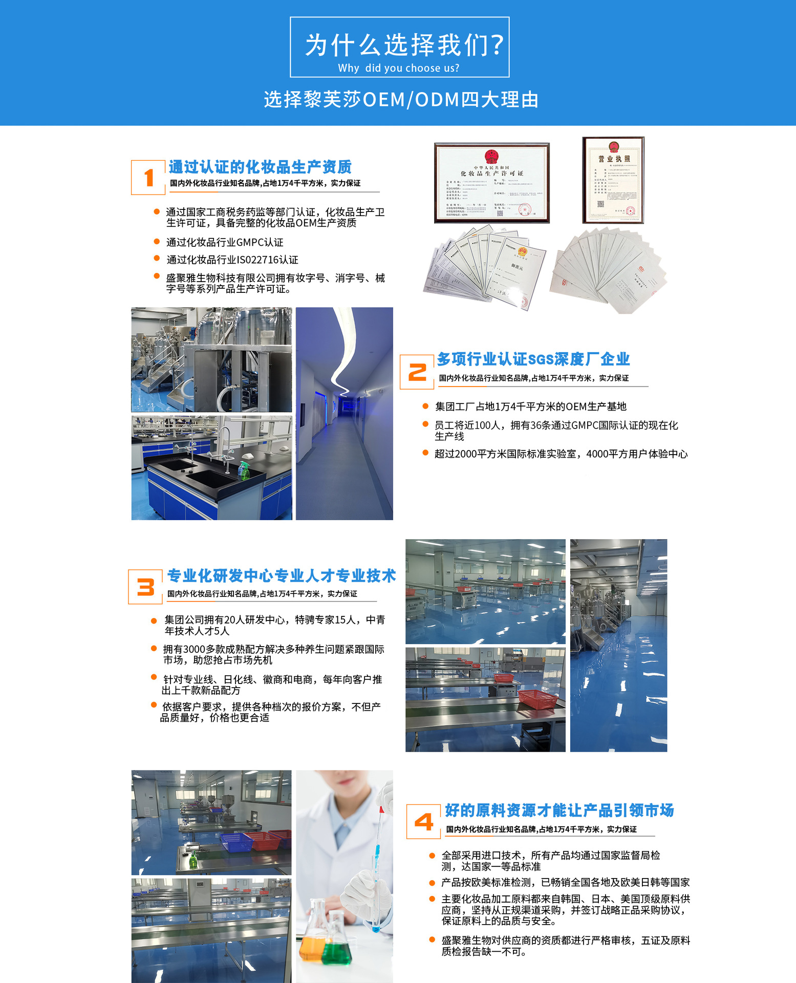 廣州黎芙莎化妝品有限公司是一家集研發(fā)、生產、批發(fā)、加工為一體的美容護膚公司。公司自有工廠,獨立的產品研發(fā)團隊,現(xiàn)代化的生產機械設備,擁有完整科學的質量管理體系。生產基地面積10000多平方米,廠房建設嚴格按照國家藥檢質量檢測標準執(zhí)行,生產及衛(wèi)生許可均達國家化妝品廠生產經營標準。 公司核心熱銷產品主要為面膜、潔面乳、精華液、保濕霜、BB霜、防曬霜、防曬乳、美白面膜、身體乳、潔面乳、水乳霜膏、泥膜、護手霜、爽膚水、化妝水、護膚品套裝等產品和加工原料。公司旗下品牌有:黎芙莎、雪彌、媚顏堂、吉舒。 廣州黎芙莎化妝品有限公司一直秉持“誠信為本,客戶至上”的宗旨,本著“品質為本,精益求精”的經營銷售理念,獲得了業(yè)界客戶的認可和贊譽,也使公司得到持續(xù)的發(fā)展。期待與各位業(yè)界新老客戶攜手共進,共贏輝煌未來!