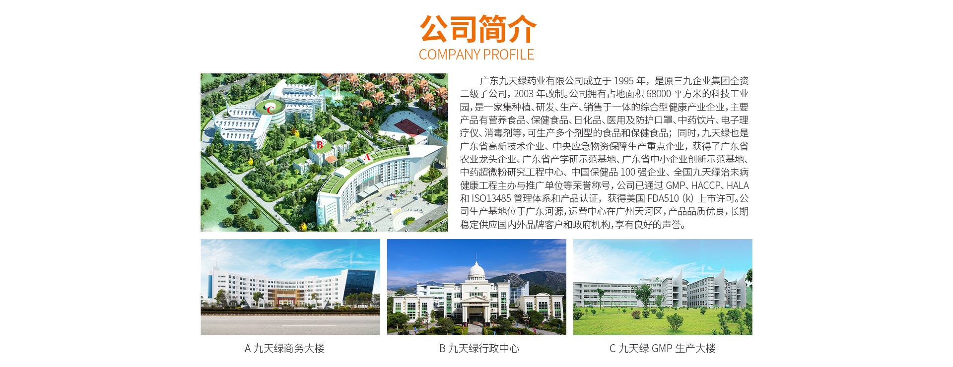 廣東九天綠藥業(yè)有限公司成立于1995年,是原三九企業(yè)集團(tuán)全資二級子公司,2003年改制。公司擁有占地面積68000平方米的科技工業(yè)園,是一家集種植、研發(fā)、生產(chǎn)、銷售于一體的綜合型健康產(chǎn)業(yè)企業(yè),主要產(chǎn)品有營養(yǎng)食品、保健食品、日化品、醫(yī)用及防護(hù)口罩、中藥飲片、電子理療儀、消毒劑等,可生產(chǎn)多個劑型的食品和保健食品;同時,九天綠也是廣東省高新技術(shù)企業(yè)、中央應(yīng)急物資保障生產(chǎn)重點(diǎn)企業(yè),獲得了廣東省農(nóng)業(yè)龍頭企業(yè)、廣東省產(chǎn)學(xué)研示范基地、廣東省中小企業(yè)創(chuàng)新示范基地、中藥超微粉研究工程中心、中國保健品100強(qiáng)企業(yè)、全國九天綠治未病健康工程主辦與推廣單位等榮譽(yù)稱號,公司已通過GMP、HACCP、HALA和ISO13485管理體系和產(chǎn)品認(rèn)證,獲得美國FDA510(k)上市許可。公司生產(chǎn)基地位于廣東河源,運(yùn)營中心在廣州天河區(qū),產(chǎn)品品質(zhì)優(yōu)良,長期穩(wěn)定供應(yīng)國內(nèi)外品牌客戶和政府機(jī)構(gòu),享有良好的聲譽(yù)